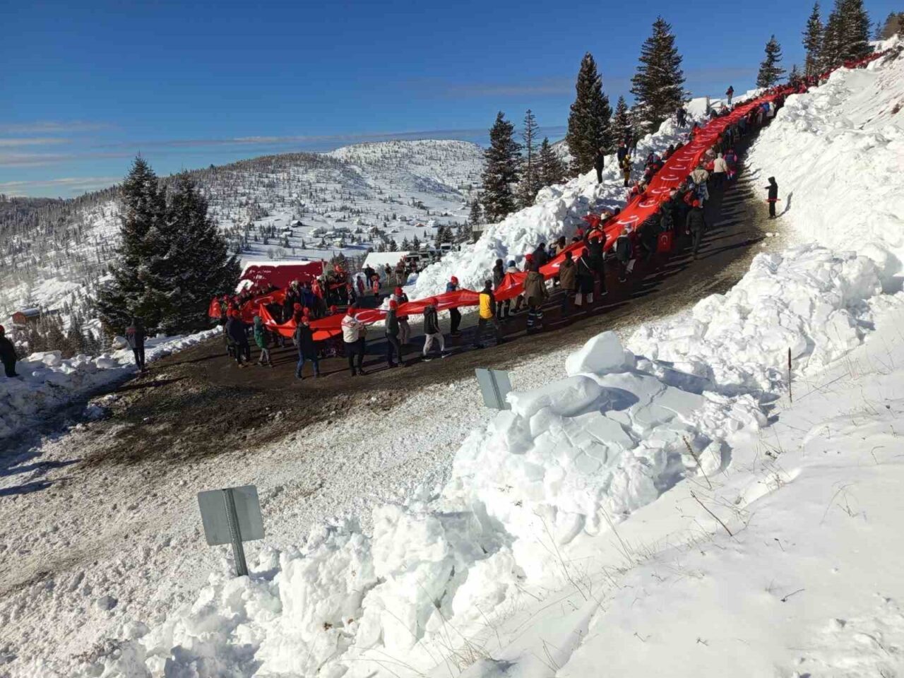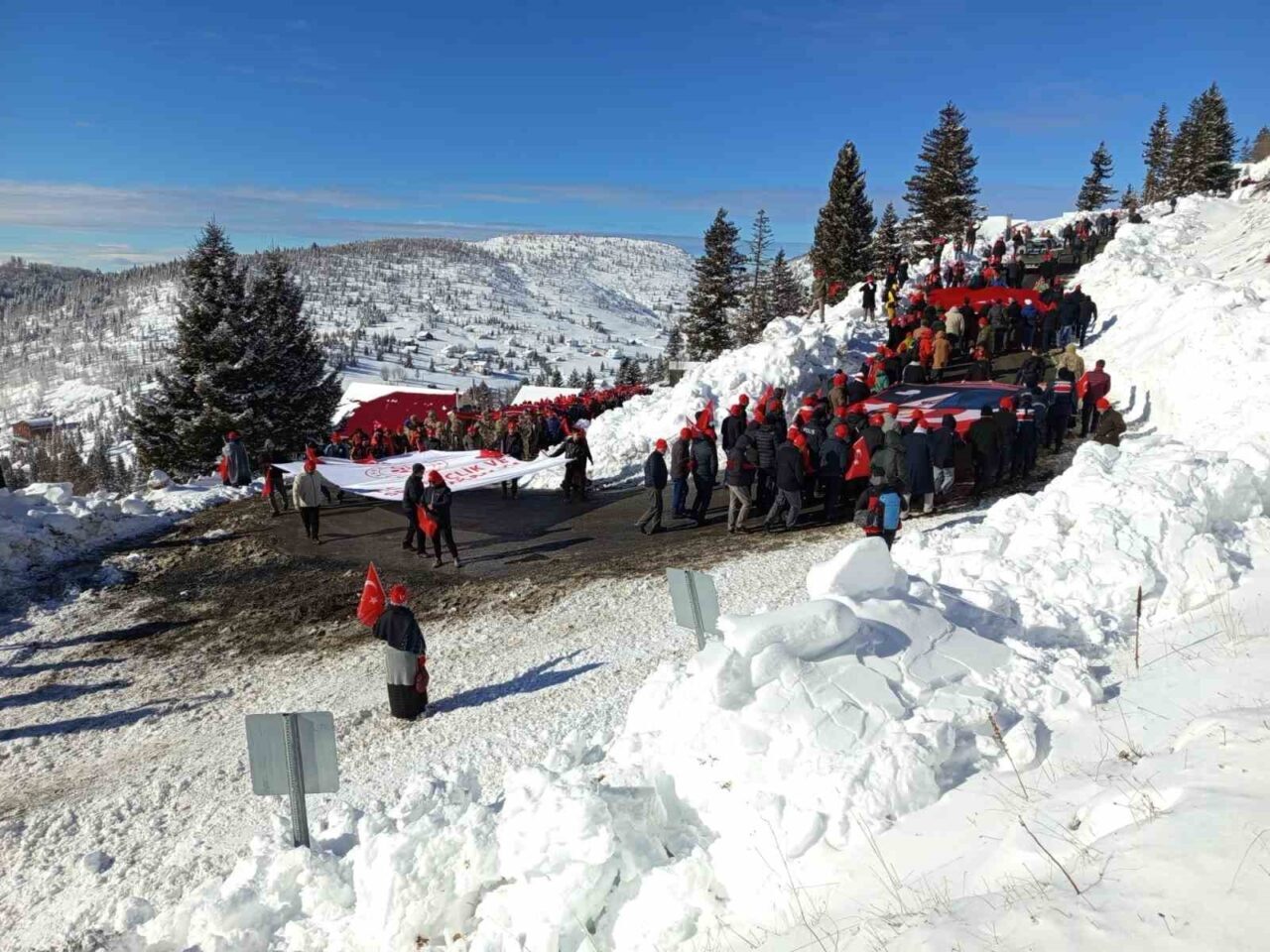 Sis Dağı Hanyanı Mevkiinde toplanılmasının ardından katılımcılar tekbirler eşliğinde ve 350 metrelik Türk Bayrağı ile 2 bin 187 rakımlı Sis Dağı’na doğru yürüdüler.