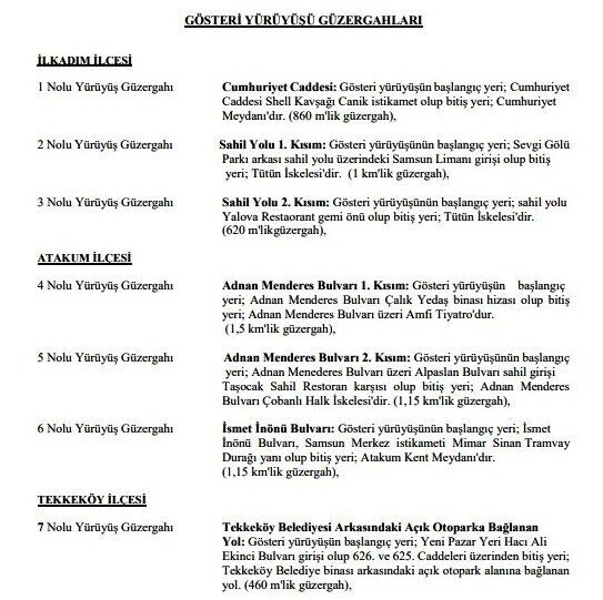 Gösteri yürüyüşü güzergâhlarıyla ilgili yapılan bilgilendirmede, İlkadım’da Cumhuriyet Caddesi ve sahil yolu 1’inci ile 2’nci kısım; Atakum’da Adnan Menderes Bulvarı 1 ve 2’nci kısım ile İsmet İnönü Bulvarı; Tekkeköy’de ise Tekkeköy Belediyesi arkasındaki açık otoparka bağlanan yol olarak ifade edildi.
