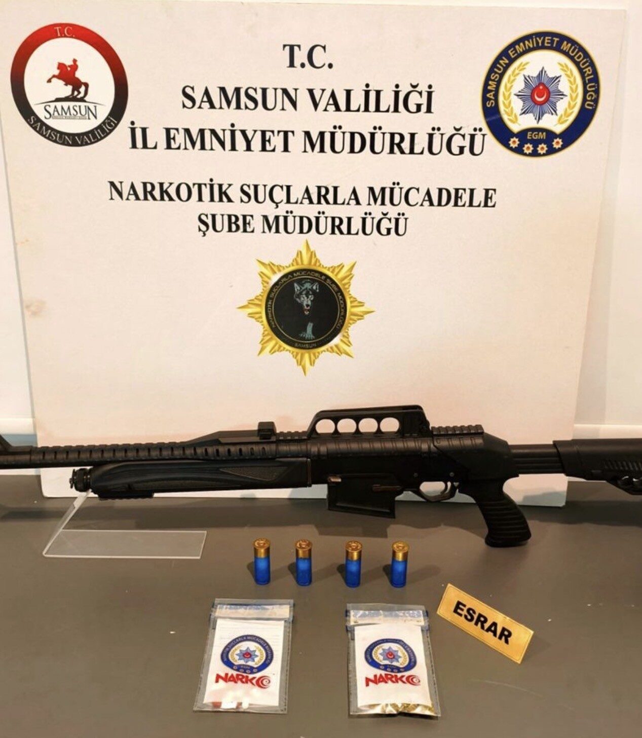 Yapılan aramalarda, 229,24 gram metamfetamin, 71 adet sentetik ecza, 21,70 gram sentetik kannabinoid, 16,49 gram esrar, 1,05 gram kokain, 3 adet hassas terazi, 4 adet uyuşturucu kullanım aparatı, 2 adet ruhsatsız tüfek ve 22 adet kartuş ele geçirildi.