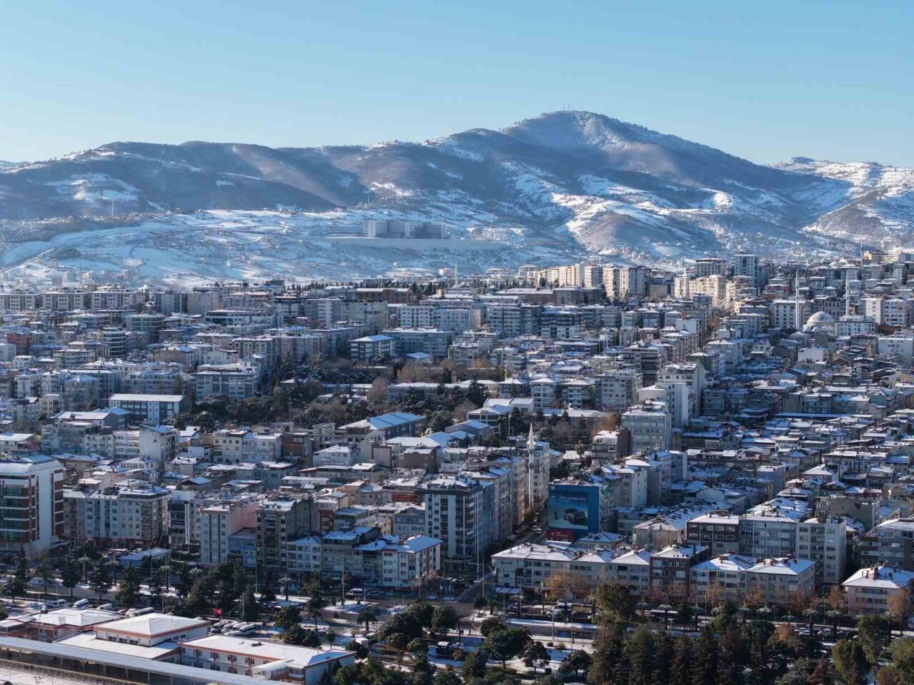 Kentte oluşan kar manzaraları sabah saatlerinde dron ile havadan görüntülendi. Görüntülerde beyaz örtüyle kaplanan binalar, meydanlar ve yollar öne çıktı.