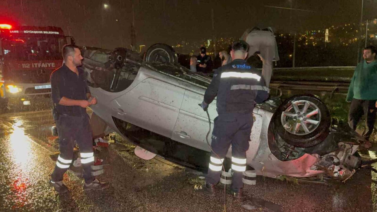 Samsun’un Canik ilçesinde meydana gelen kazada kontrolden çıkan bir otomobil takla attı. Olayda araç tamamen kullanılamaz hale gelirken, içindeki dört kişi kazayı hafif sıyrıklarla atlattı.