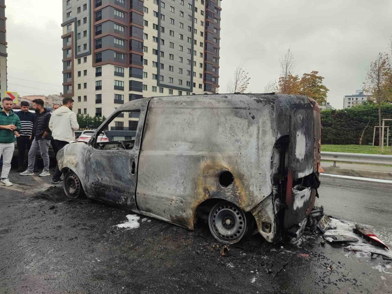 BAYRAMPAŞA’DA SEYİR HALİNDE ALEV ALEV YANAN ARAÇTAN GERİYE DEMİR YIĞINI KALDI.