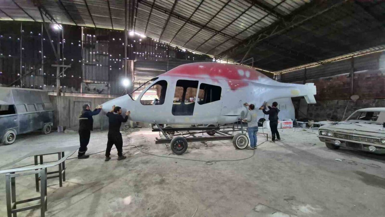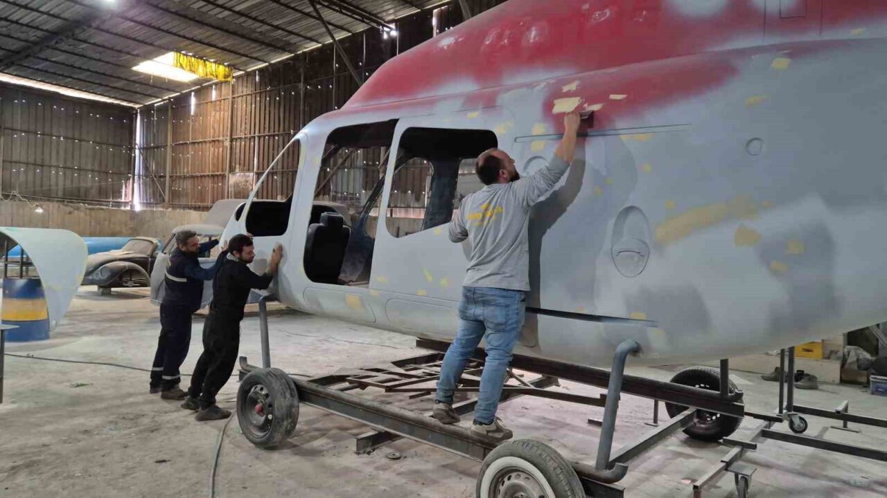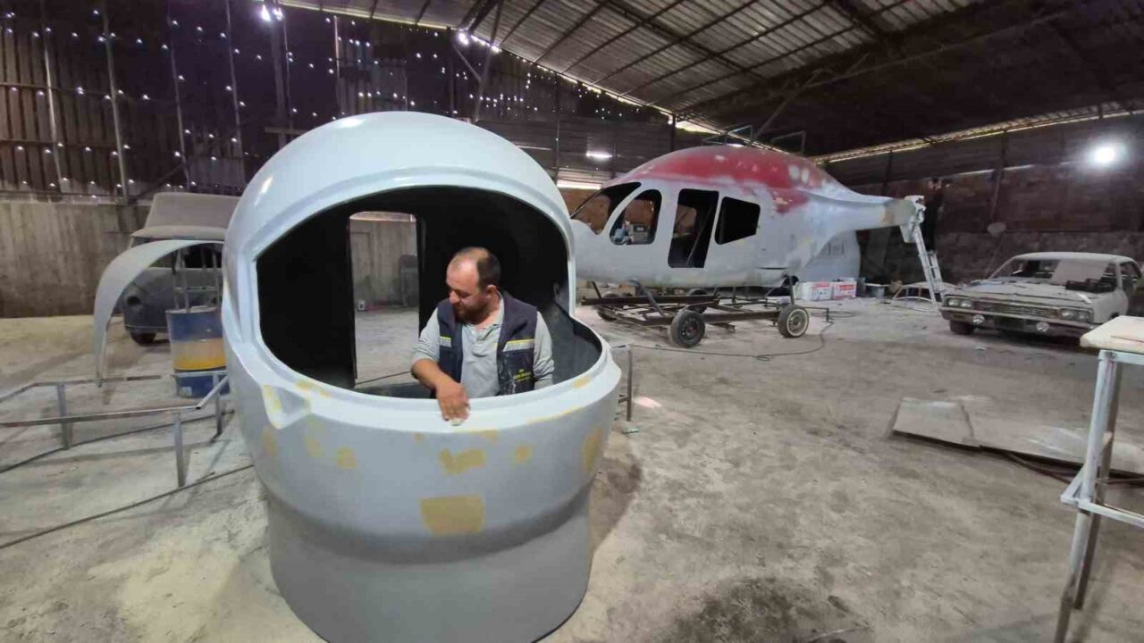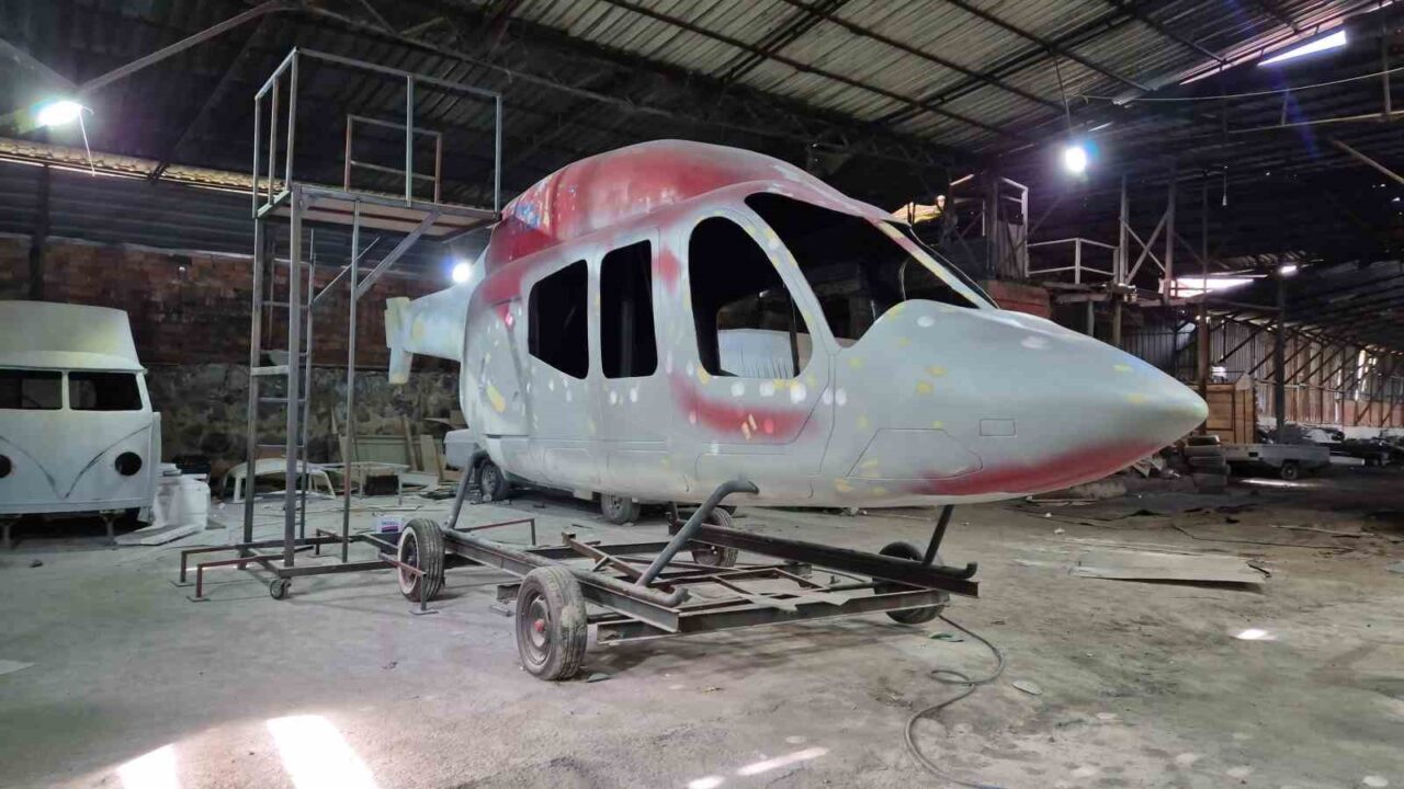 MARANGOZ, ÜRETİMİNİ SÜRDÜRDÜĞÜ HELİKOPTERİN FARKLI AMAÇLARLA DEĞERLENDİRİLEBİLECEĞİNİ İFADE EDEREK, “HELİKOPTERİ ANTİKACI BİR ABİMİZDEN ALDIK. HURDAYA VERİLMİŞTİ, GÖRSELİ FİBER BİR ÜRÜNDÜ. ŞİMDİ BU ÜRÜNDEN KOMPLE RESTORASYON YAPACAĞIZ. BOYAYACAĞIZ, KAPILARINI AKTİF HALE GETİRECEĞİZ. DAHA SONRA KALIP ALIP ÜRETİME GEÇECEĞİZ. BU ÜRÜN BUNGALOV YAPILABİLİR, KAFE YAPILABİLİR, SİMÜLATÖR OLABİLİR. HAVUZ KENARINDA BİR GÖRSEL OLARAK DA KULLANILABİLİR. YANİ TAMAMEN MÜŞTERİNİN İSTEĞİNE GÖRE SİSTEMİ KURUYORUZ” DEDİ.