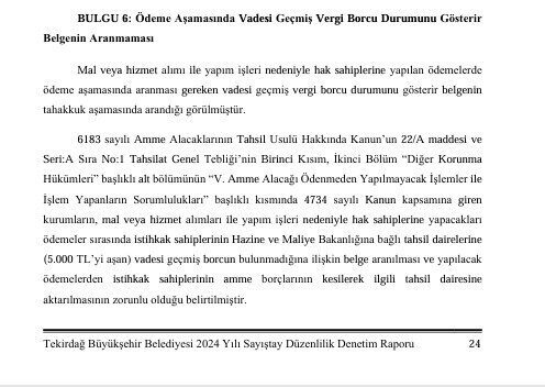 Raporda ayrıca, sözleşmeleri sona eren yükleniciler hakkında, mevzuat gereklilikleri doğrultusunda katılamama yasakları uygulanmadığı belirtiliyor. Bazı ilçelerde, belediyenin yetkisi olmasına rağmen imar denetimleri yapılmadığı ve yüklenici ödemelerinde “vadesi geçmiş vergi borcu yoktur” belgelerinin kontrol edilmediği, böylece usulsüz ödemelerin gerçekleştirildiği ihsas edildi.