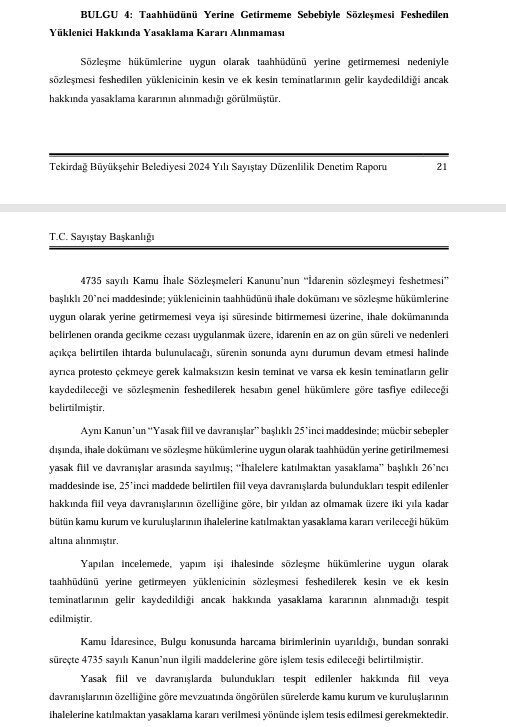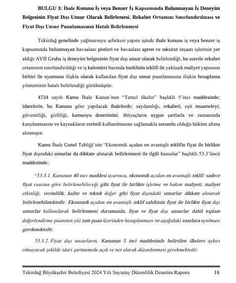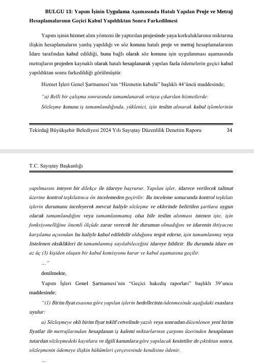Sayıştay, CHP’li Tekirdağ Büyükşehir Belediyesi’ne yönelik 2024 yılı denetimleri kapsamında, belediyenin farklı birimlerinde toplamda 19 mevzuata aykırılık belirlendi. Bu raporda, ihaleler, mali işlemler, personel ödemeleri ve imar denetimlerine dair önemli usulsüzlüklere dikkat çekildi. Uzun zamandır tamamlanamayan yapı projeleri, ihale şartnamelerinin rekabeti engelleyici niteliği, izinsiz yapılan kamuoyu araştırmaları için ödemeler, kayıtdışı personel için fazla mesai ödenmesi ve ticari plakaların göz ardı edilen şekilde kullanılması gibi hususlar raporda vurgulandı.