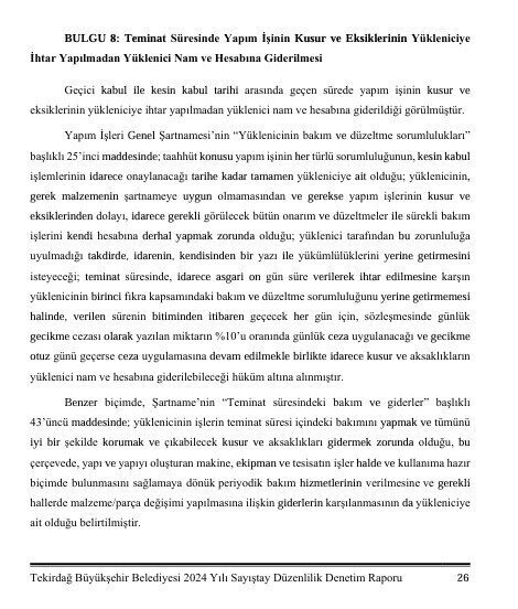 Raporda ayrıca, POS cihazları ile yapılan tahsilatların zamanında bankaya iletilmediği, yüklenicilerin kusur ve eksikliklerini düzeltmesi için yazılı ihtar yapılmadan işlemlere başlandığı tespit edildi. Yeni fiyatlandırma oluşturulurken Ticaret ve Sanayi Odası’nın onayının alınmaması ve bazı projelerdeki zorunlu sigorta işlemlerinin gerçekleştirilmemesi gibi konulara da dikkat çekildi.
