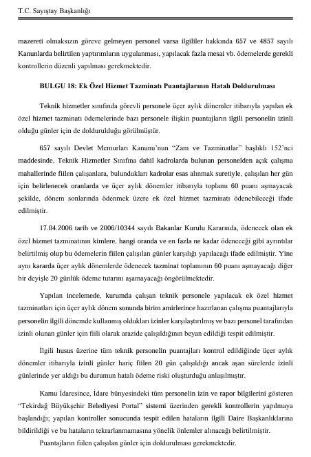 Son olarak, denetim sürecinde personel takip sisteminde kaydı olmayan bir çalışana haksız yere fazla mesai ödemesi yapıldığı, ek özel hizmet tazminatı puantajlarının hatalı olarak düzenlendiği ve yevmiye defterlerinde boş sayfaların bulunduğu da belirlendi. Sayıştay yapılan denetimlerde aykırılıkların ihale, mali işler, personel, imar ve muhasebe alanlarında yoğunlaştığını bildirdi. Öte yandan, belediye yetkilileri, bazı konularda düzeltici adımlar atılacağını duyurdu.