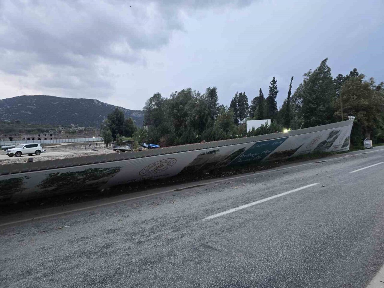 İzmir’in Selçuk ilçesinde fırtına nedeniyle büyük reklam panoları ve demir konstrüksiyonlar anayola devrildi