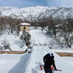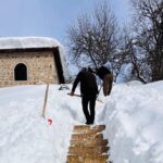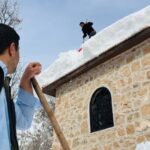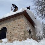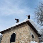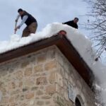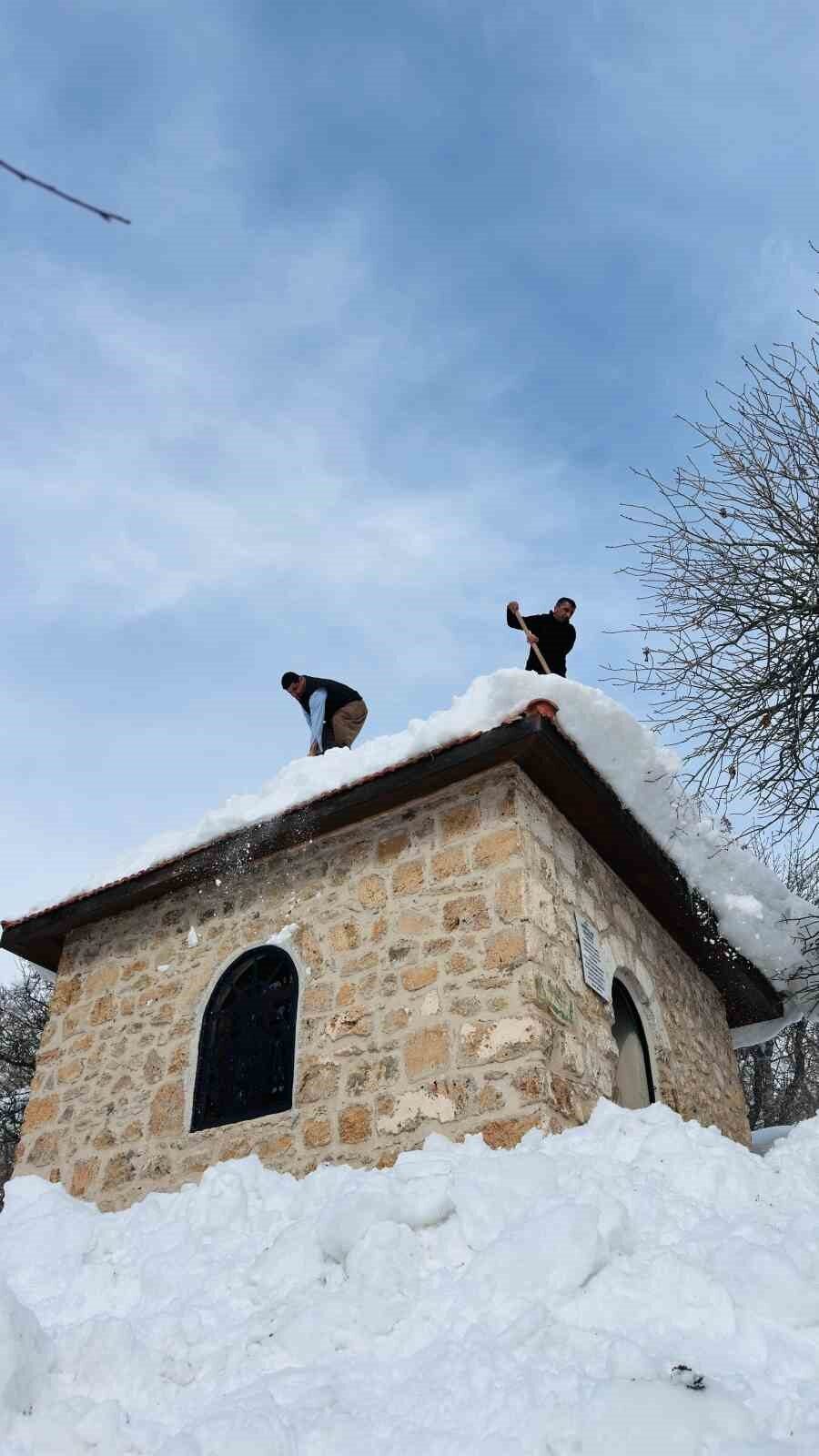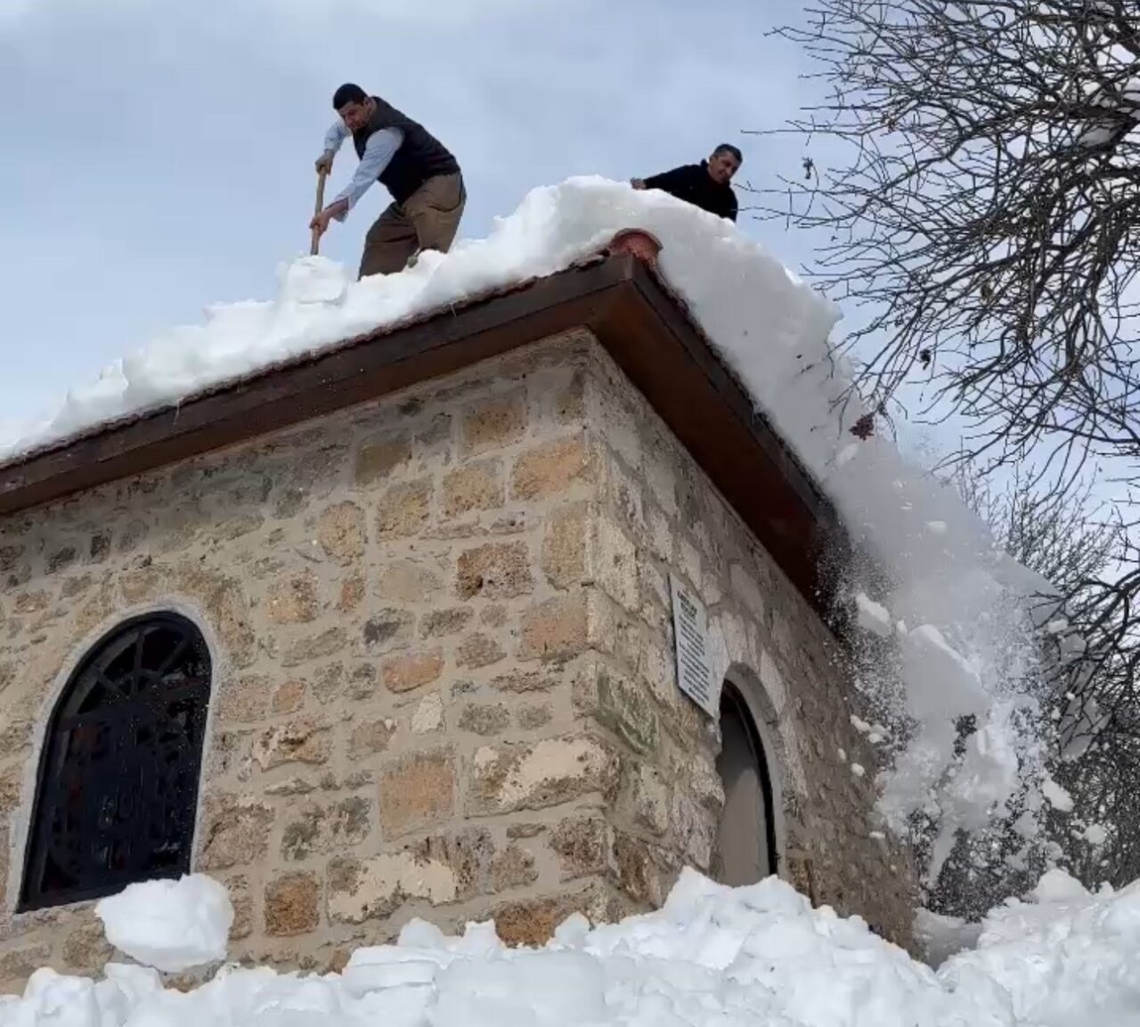 Hakkari’nin Şemdinli ilçesinde etkili olan yoğun kar yağışının ardından Bağlar köyündeki tarihi türbelerin çatısında biriken kar kütleleri, köy muhtarı ve imamı tarafından temizlendi.