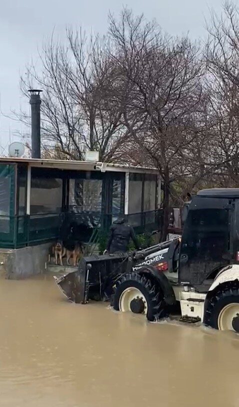 Antalya’nın Serik ilçesinde etkili olan sağanak sonrası etrafı sularla çevrilmiş bir evdeki 4 köpeği vatandaşlar iş makinesi yardımıyla kurtardı.