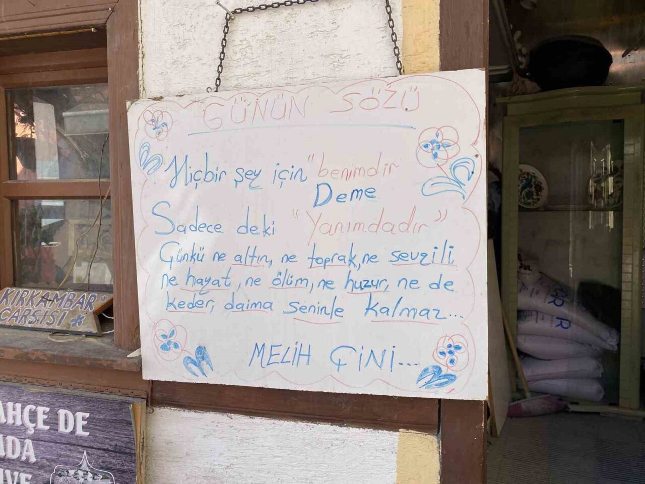 Kahramanmaraş’ta meydana gelen 7,8 ve 7,5 büyüklüğündeki deprem, büyük hasara yol açarak çok sayıda binanın yıkılmasına sebep oldu. Bu felaket sonucunda 50 binden fazla vatandaş hayatını kaybetti. Eskişehir’in tarihi Odunpazarı Evleri bölgesinde bulunan çini atölyesinde gelen Serpil Işık, meydana gelen bu acı olaylara dikkat çekmek amacıyla dükkanının önündeki beyaz tahtaya bir yazı yazdı. Bu yazıda “Hiçbir şey için ‘benimdir’ deme. Sadece de ki, ‘yanımdadır.’ Çünkü ne altın, ne toprak, ne sevgili, ne hayat, ne ölüm, ne huzur, ne de keder daima seninle kalmaz.” ifadelerine yer verildi. İki yıl boyunca aynı yerde duran bu yazı, karşıdan geçenlerin dikkatini çekmeye devam ediyor.