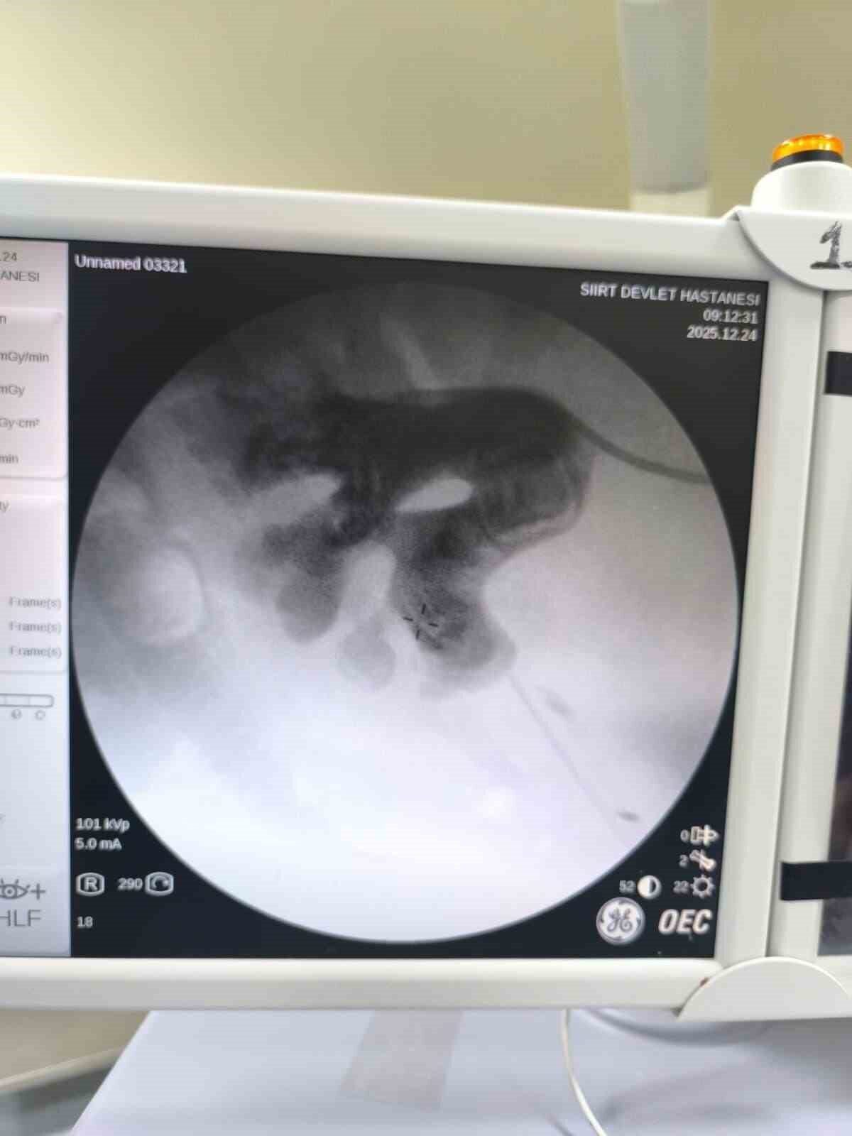 **Siirt’te idrar yanması şikayetiyle hastaneye gelen Fatih Aslan’da çıkan geyik boynuzu taşı 1 buçuk saatte temizlendi.**