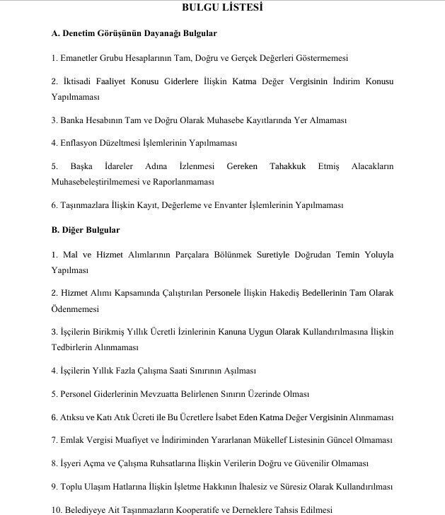 Rapor, belediyede iç kontrol sisteminin mevcut olmadığını ortaya koyuyor. Sayıştay, bu eksikliğin hata ve usulsüzlükleri önlemede büyük bir sorun oluşturduğunu belirterek, acil önlem alınması gerektiğini ifade etti.
