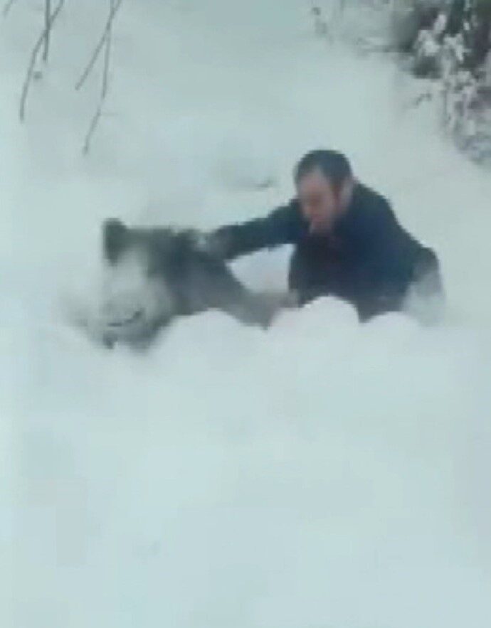 Sinop’un Erfelek ilçesinde karlı bir yol üzerinde ilerleyen bir araç, yaban domuzu sürüsüyle karşılaştı. Araçtan inen bir vatandaş, yaban domuzunu kovalayarak hayvanı yakaladı ve ardından geri bıraktı. O anlar telefon kamerasıyla kaydedildi.