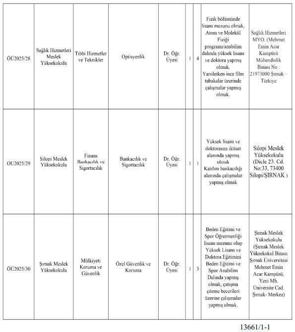 Silopi Meslek Yüksekokulu’nda, Finans Bankacılık ve Sigortacılık bölümünde Bankacılık ve Sigortacılık anabilim dalı için ayrılan Doktor Öğretim Üyesi pozisyonunda, “Katılım bankacılığı konusunda akademik çalışmalar gerçekleştirmiş olmaları” gerekmekte. Ayrıca, Mülkiyeti Koruma ve Güvenlik bölümü için yapılan ilan da, “Çatışma çözme becerileri üzerine araştırmalar yapmış olmaları” şartını içermektedir.