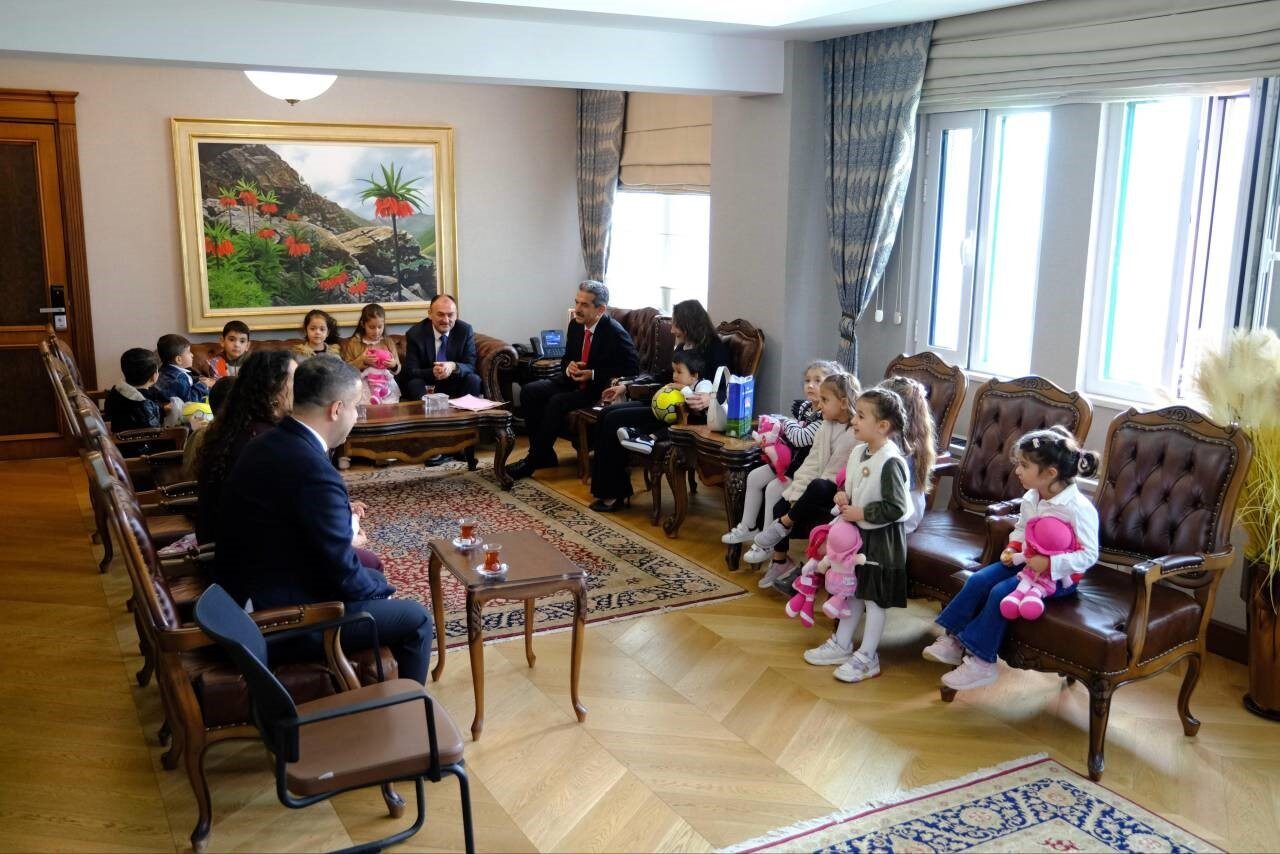 Şırnak Vakıf Anaokulu’nun minik öğrencileri, İl Milli Eğitim Müdürü Bilal Yılmaz Çandıroğlu ve öğretmenleriyle birlikte Şırnak Valisi Birol Ekici’yi makamında ziyaret etti.