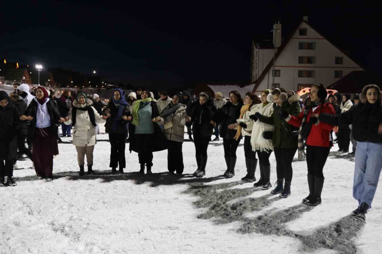 Sivas Yıldız Dağı Kış Sporları Turizm Merkezi’nde resmi sezon açılışı, kar üzerinde oynanan halaylar ve gece kayağı ile başladı.