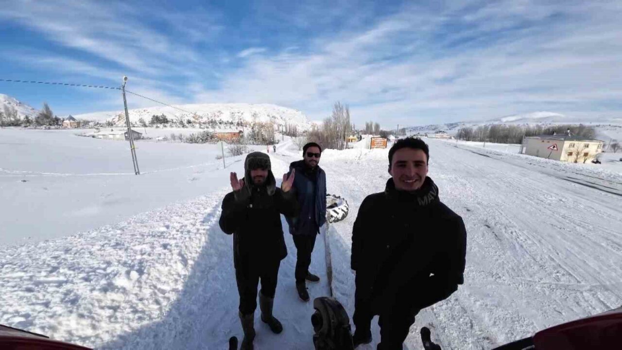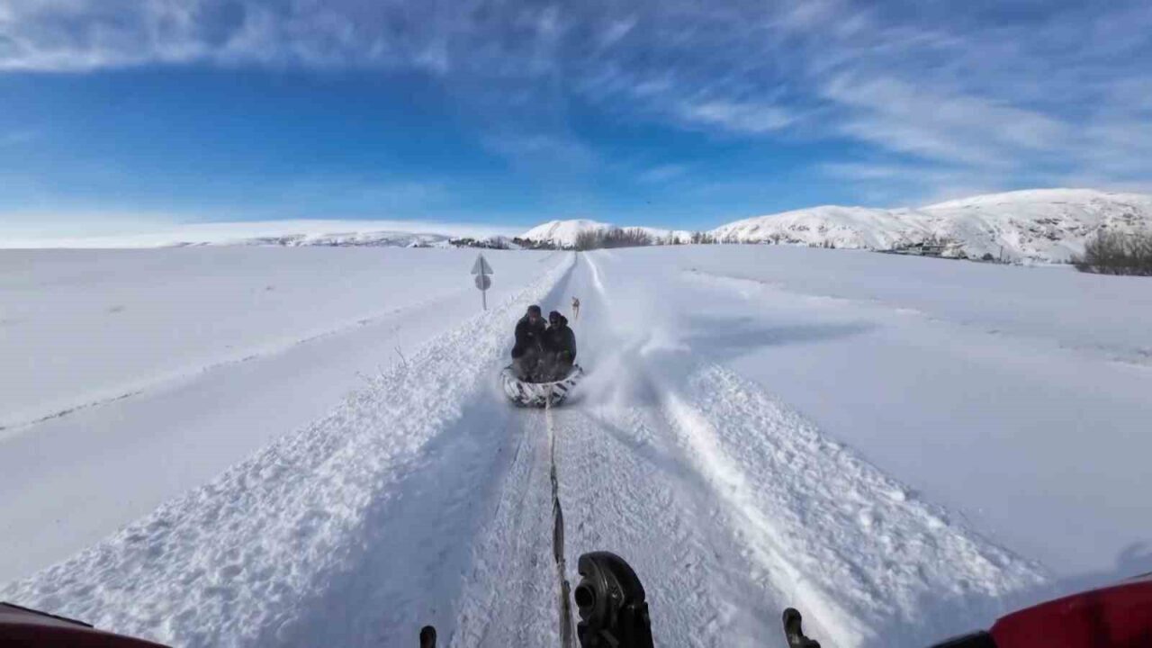 Sivas’ta yoğun kar yağışını eğlence haline getiren bir vatandaş, traktöre bağlı lastikle köy sokaklarında kayarak gezdi. O anlar aksiyon kamerası ve dron ile kaydedilirken, ortaya renkli görüntüler çıktı.