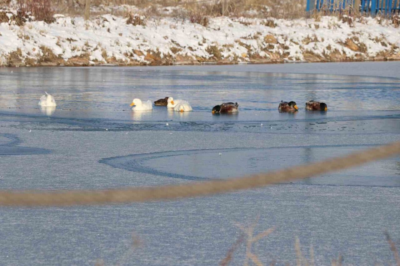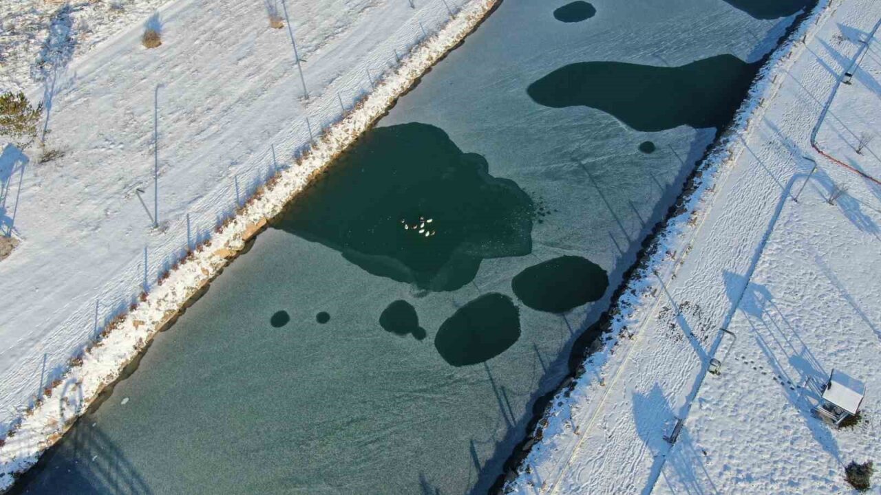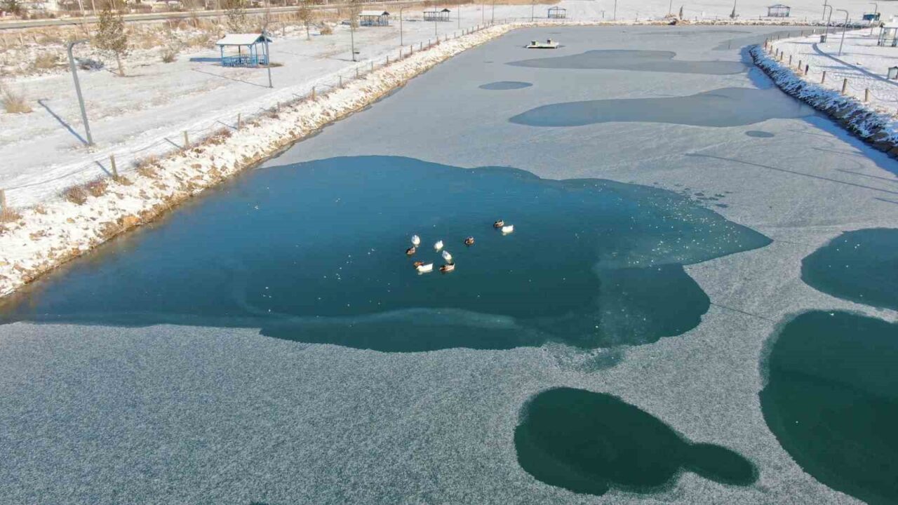 Sivas’ta soğuk hava etkisiyle yapay gölet buzla kaplanırken, ördekler suyun açık kısmında yüzmeye çalıştı.