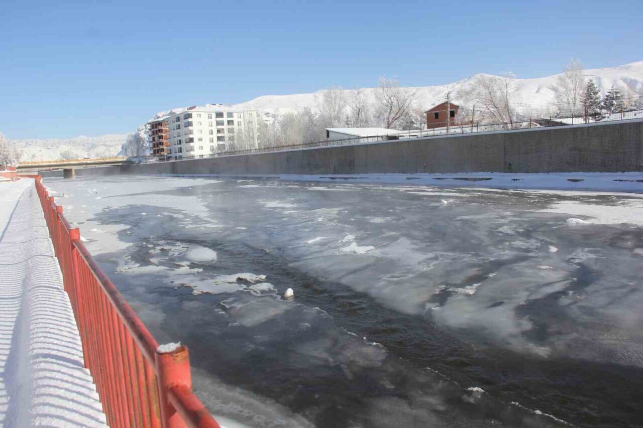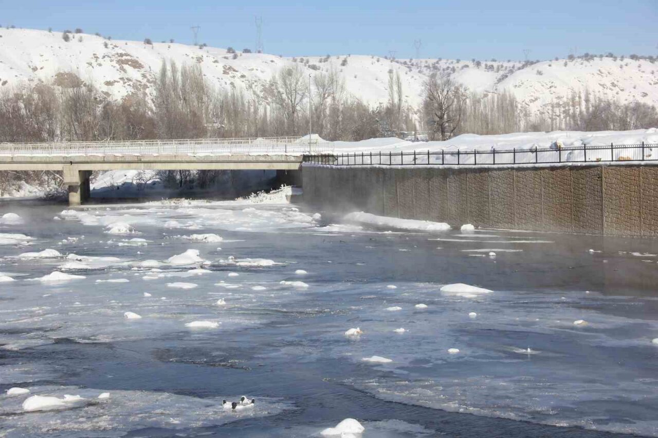 Termometrelerin eksi 21 dereceyi gösterdiği Sivas’ta Kızılırmak’ın yüzeyi buzla kaplandı
