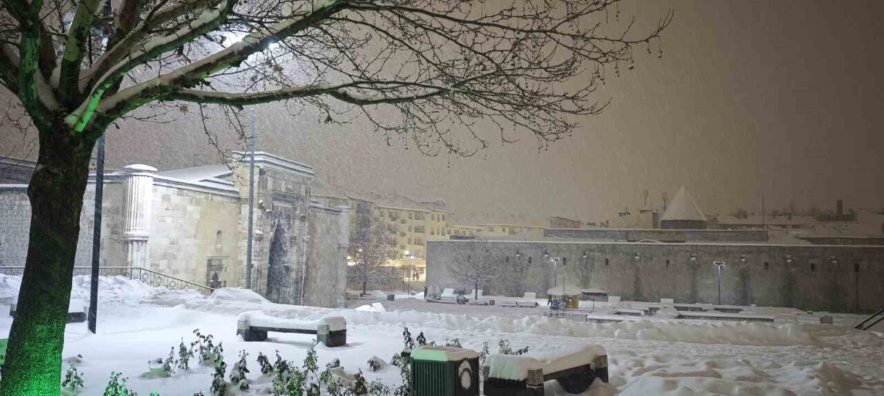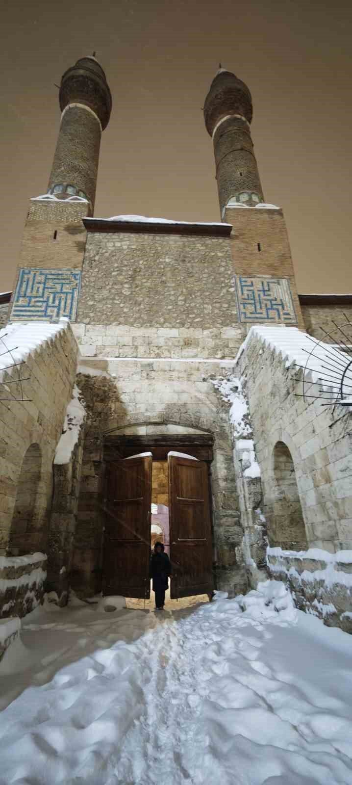 Selçuklu, Osmanlı ve Cumhuriyet dönemi eserleri bir arada bulunduran Sivas Tarihi Kent Meydanı’nı adeta yağan karla birlikte beyaz gelinliğini giydi.