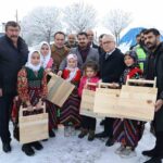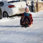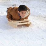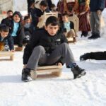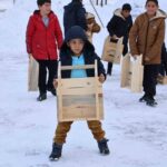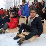 Sivas’ta bir köyde daha önce poşet ve leğen ile kayan öğrencilere ahşap kızak hediye edildi