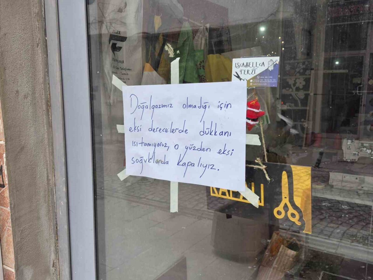 Eskişehir’de bir terzi esnafının doğalgazı olmadığı için soğuk günlerde ısıtamadığı ve bu sebeple açmadığı dükkanın camına astığı ilginç yazı dikkat çekti.