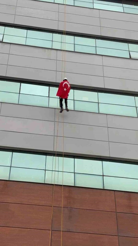 Aydınlı uzman, Nusaybin sınırındaki bayrak saldırısına tepki olarak 30 metre yüksekliğe tırmandı.