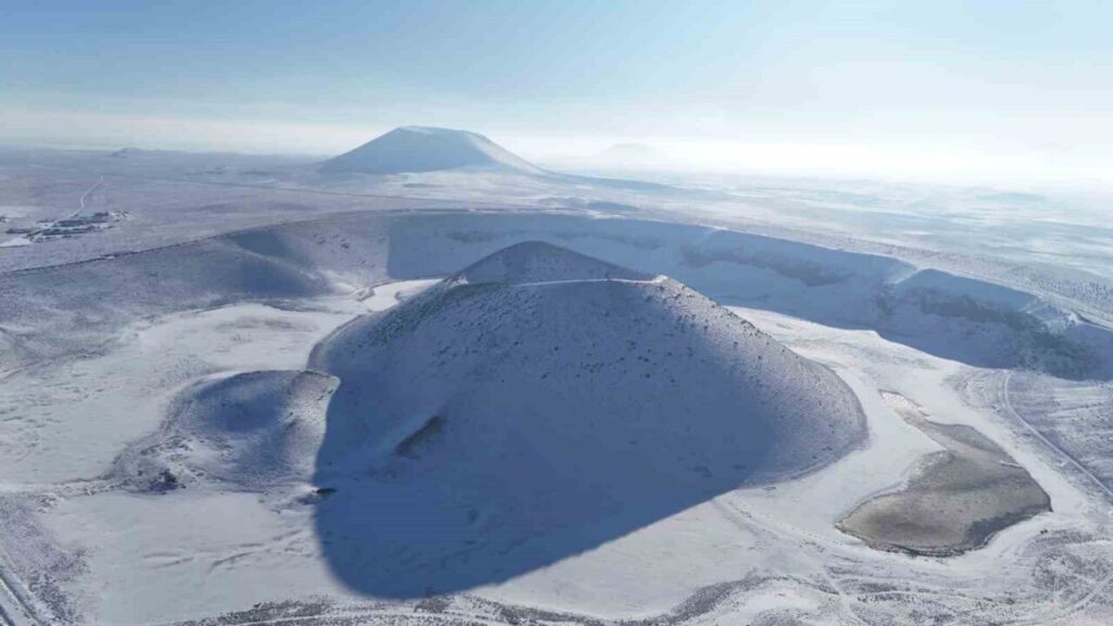 Karapınar’daki Meke Gölü kar yağışı sonrası muhteşem görüntüler sundu, ziyaretçiler fotoğrafladı.