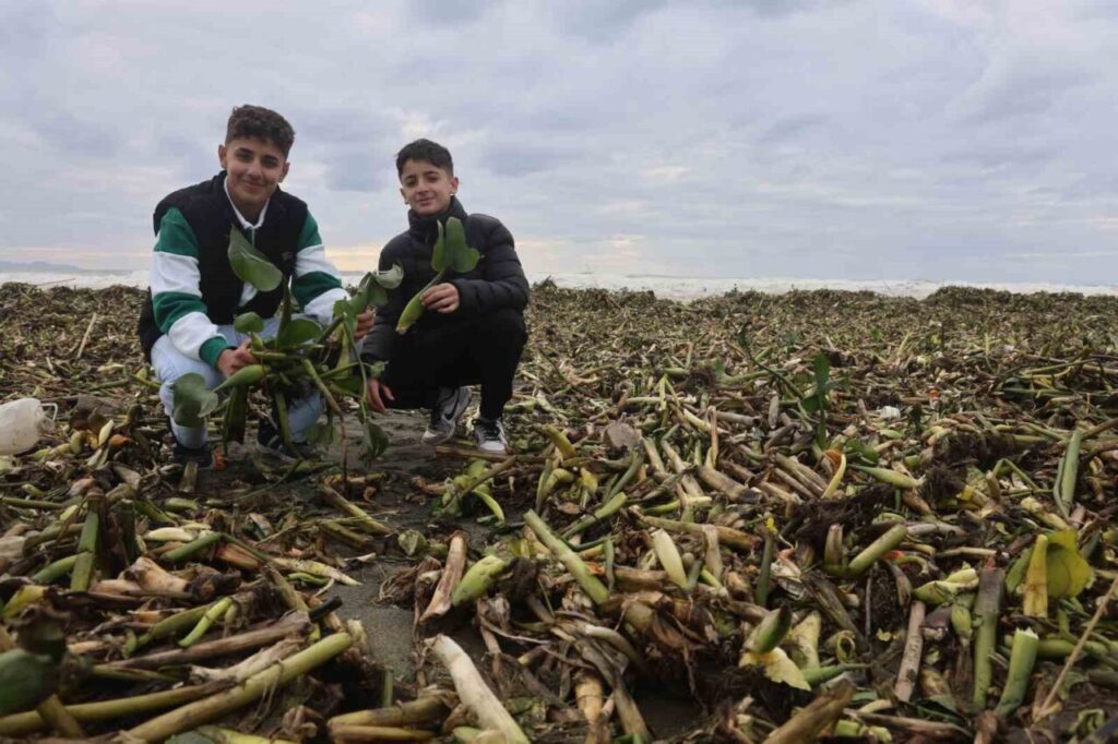 Hatay’da Asi Nehri’nden Akdeniz’e dökülen su sümbülleri, şiddetli fırtınayla kıyıyı yeşil kapladı.