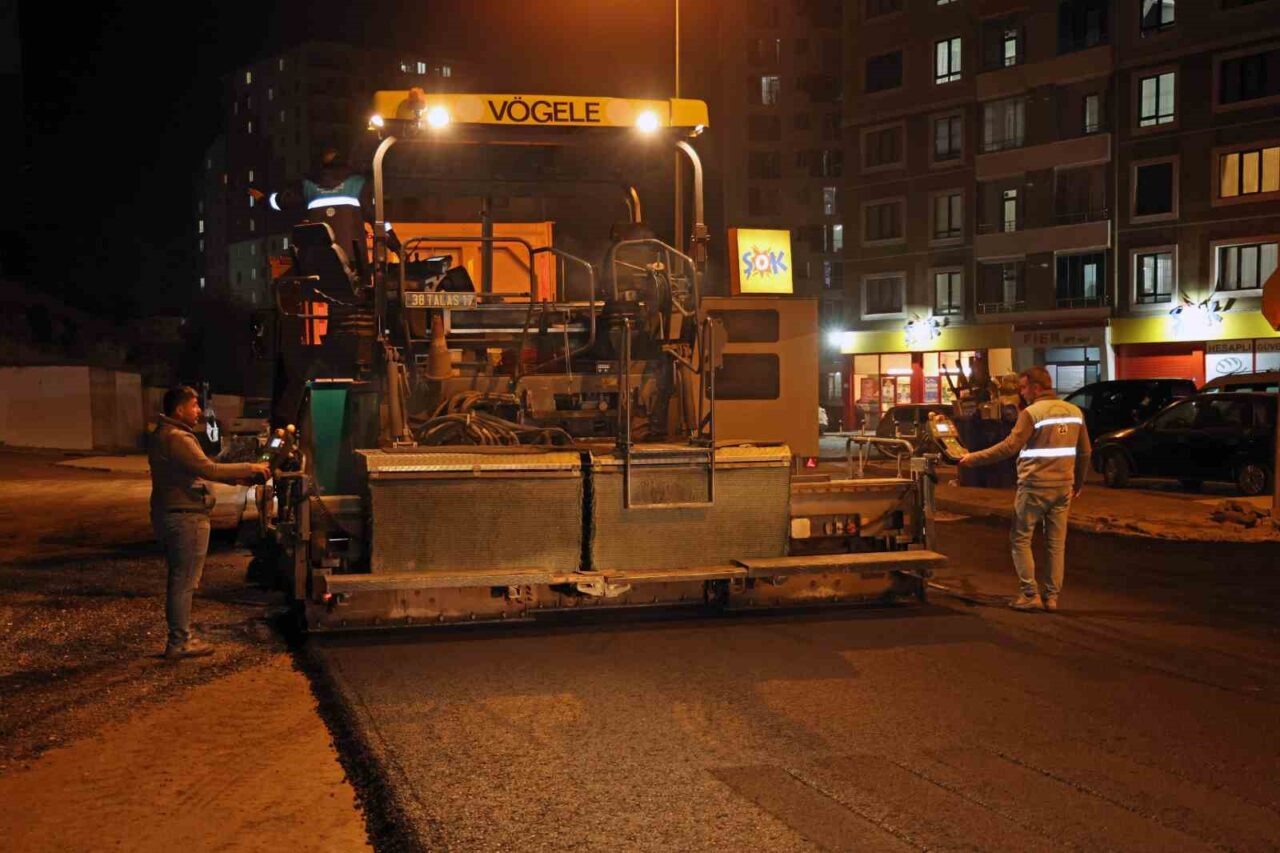 Talas Belediyesi, Mevlana Mahallesi'nde Tamer Caddesi'nde gece asfalt serim çalışmaları