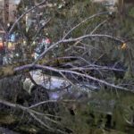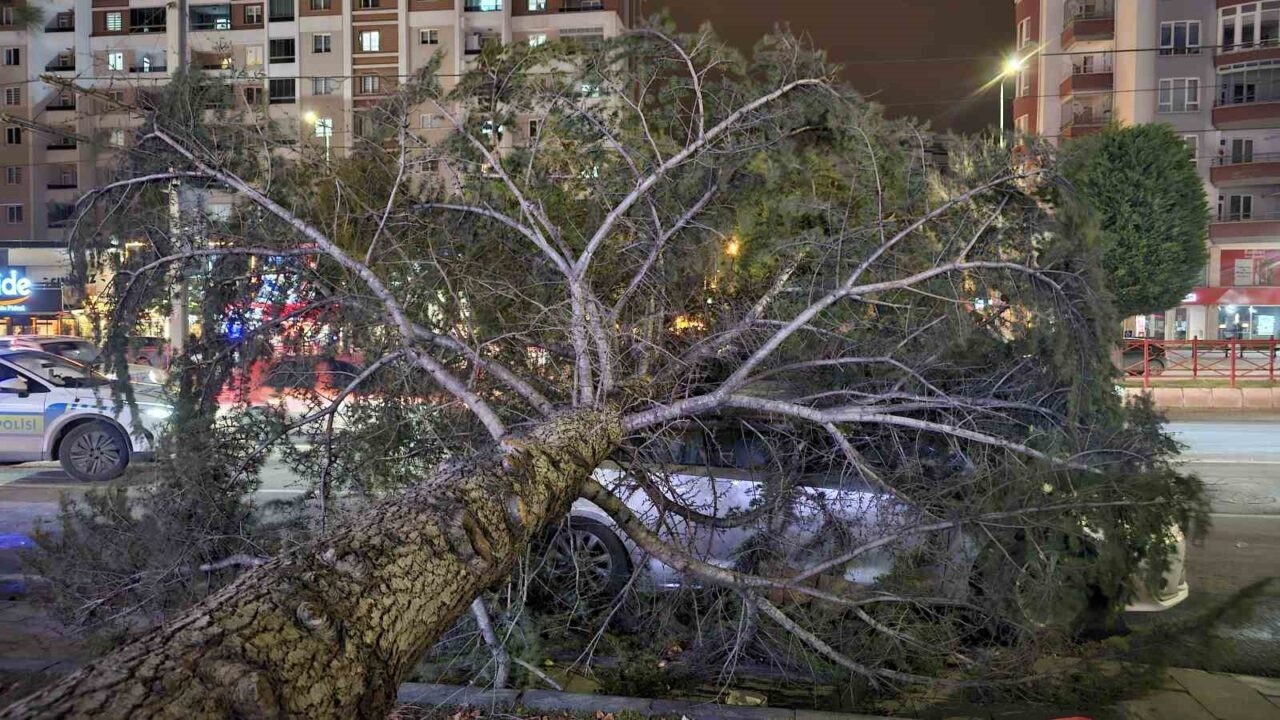 Kayseri’nin Talas ilçesinde şiddetli rüzgardan dolayı otomobilin üzerine ağaç devrildi.