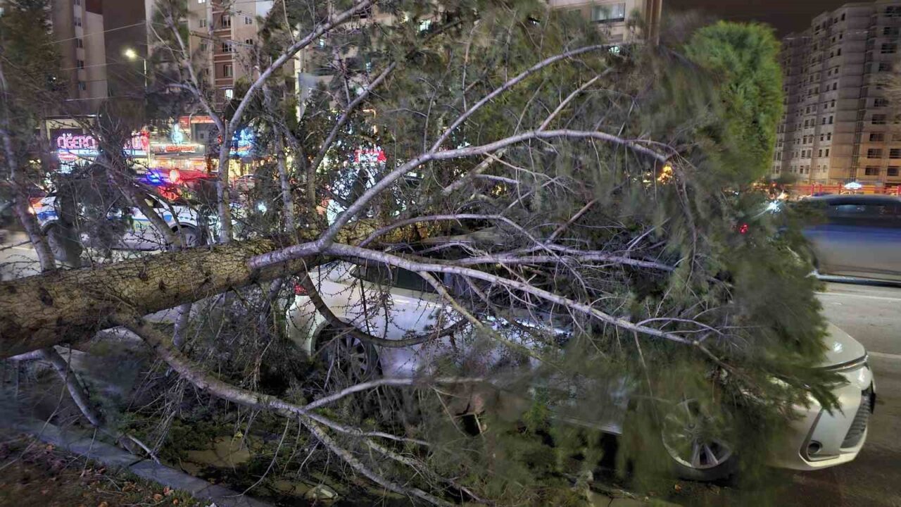Kayseri’nin Talas ilçesinde şiddetli rüzgardan dolayı otomobilin üzerine ağaç devrildi.