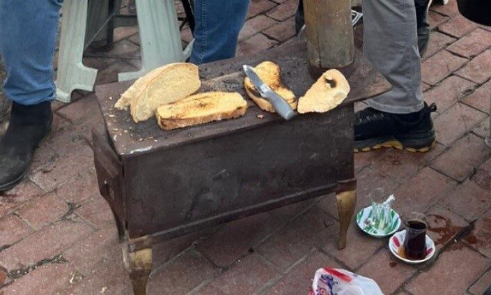Tahsin Buruk Caddesi’nde giyim ve çeşitli sektörlerde hizmet veren işletmeciler, sabahın erken saatlerinde dükkanlarını açtıktan sonra bir araya gelerek kurdukları mini soba ile kahvaltı geleneğini sürdürüyor.