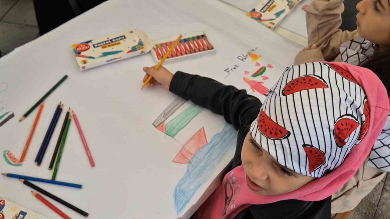 ETKİNLİKTE KÜÇÜK YAŞTAKİ ÇOCUKLAR, GAZZE’DE YAŞANANLARA KARŞI HİSSETTİKLERİNİ KÂĞITLARA YANSITARAK MEYDANDA SERGİLEDİ. KATILIMCILAR, ÇOCUKLARIN ÇİZDİĞİ RESİMLERE YOĞUN İLGİ GÖSTERDİ.