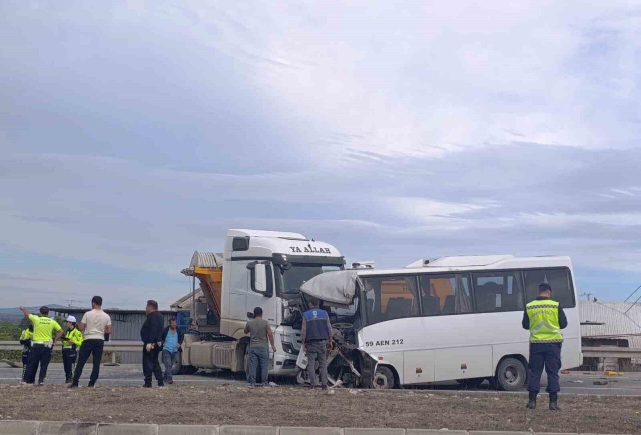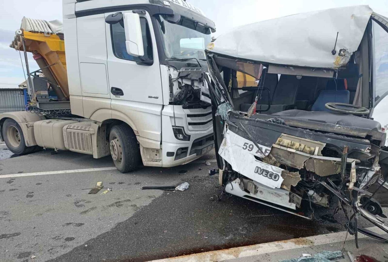 Tekirdağ’ın Saray ilçesinde meydana gelen feci kazada, minibüs ile silobas dorse tırının çarpışması sonucu minibüs sürücüsü ağır yaralandı.