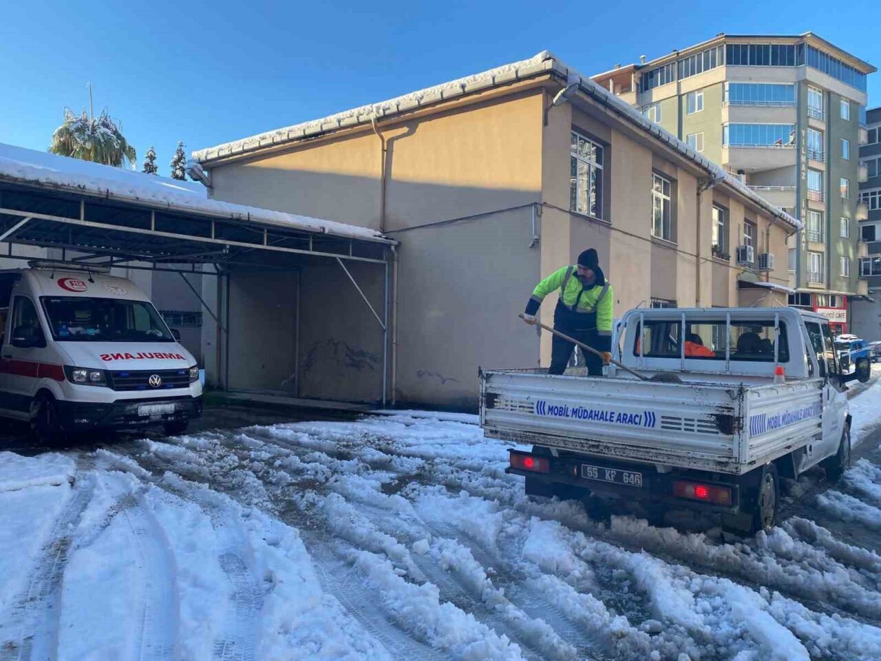 Terme Belediyesi Fen İşleri ve Temizlik İşleri Müdürlüklerine bağlı ekipler, kar yağışının başladığı ilk anlardan itibaren sahaya inerek kar küreme ve tuzlama çalışmalarına başladı. Kar kalınlığının yer yer yüksek seviyelere ulaştığı üst kesimlerde, özellikle 112 Acil servis ambulanslarının hastalara ulaşabilmesi için iş makineleriyle yol açma seferberliği ilan edildi.