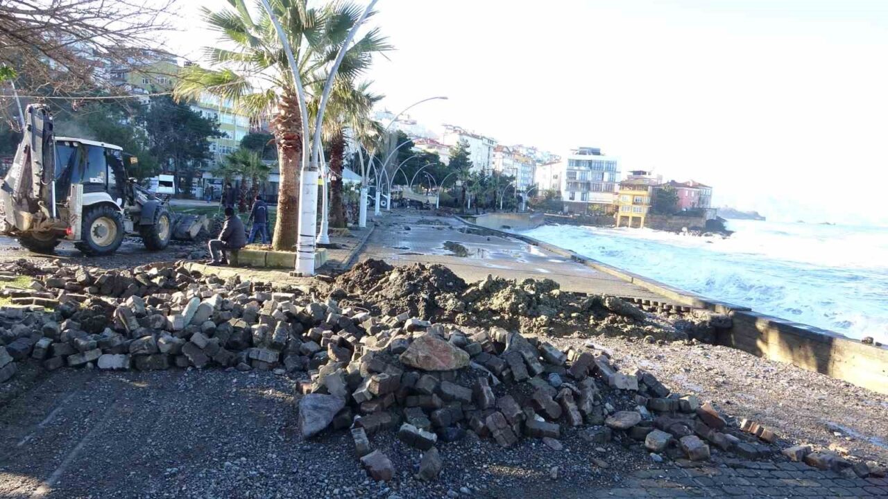 Fırtına ve dev dalgaların etkili olduğu Tirebolu’da hasar tespit çalışmaları devam ederken, belediye ekipleri sahil düzenleme ve onarım çalışmalarına da başladı.
