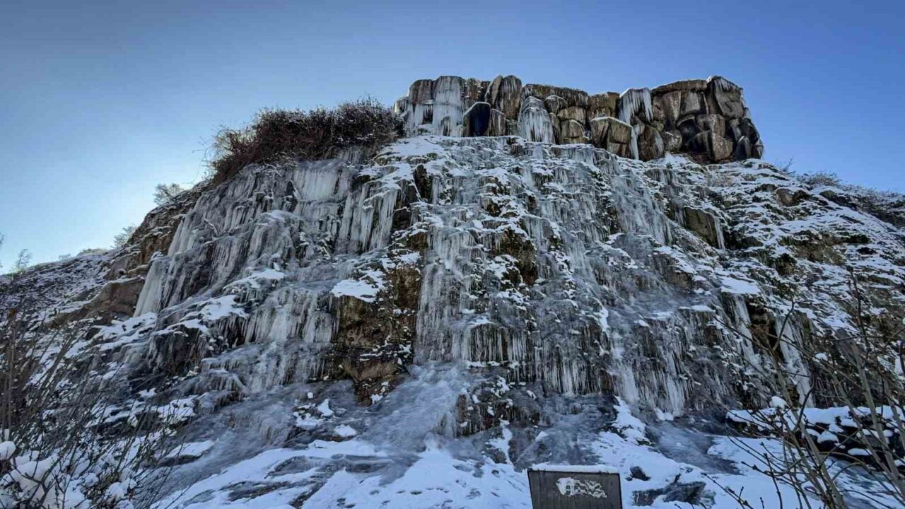 Tokat’ta etkili olan dondurucu soğuk hava, Turhal ilçesinde görsel bir şölen yarattı. İlçe merkezi Cumhuriyet Caddesi üzerinde yer alan şelale, hava sıcaklıklarının sıfırın altına düşmesiyle tamamen dondu. Şelaleden akan suların buz tutmasıyla oluşan sarkıtlar ve buz tabakaları, kartpostallık manzaralar oluşturdu. Soğuk havanın etkisiyle şelalenin çevresinde metrelerce uzunluğa ulaşan buz sarkıtları dikkat çekerken, beyaz örtüyle kaplanan kayalık alanlar görsel güzellik sundu. Donmuş şelale, hem ilçe sakinlerinin hem de yoldan geçen vatandaşların ilgisini çekti.