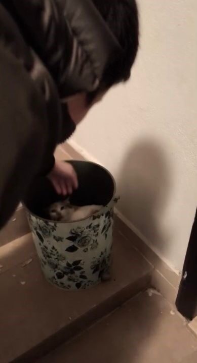 Osmaniye’nin Toprakkale ilçesinde soğuktan korunmak isteyen kedi apartman içerisindeki çöp kutusuna sığındı.