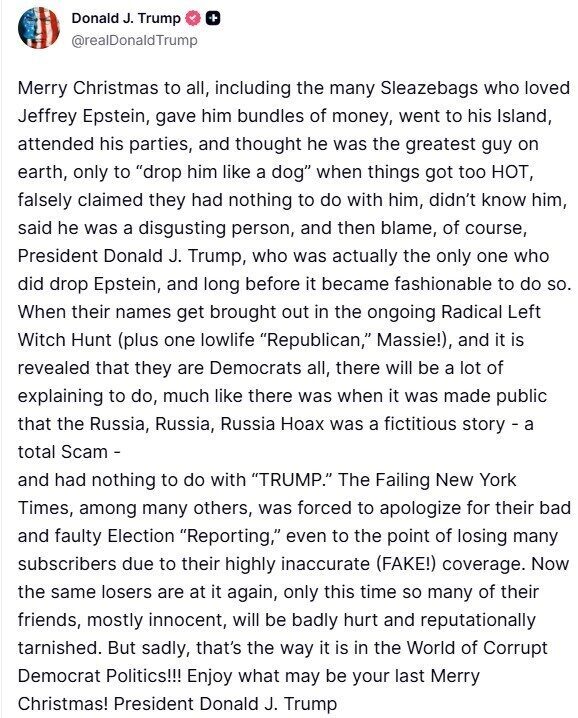 Trump, Truth sosyal medya platformu üzerinden gönderdiği Noel mesajında, rakiplerini cinsel istismar ile suçlanan Epstein ile olan bağlantıları üzerinden hedef aldı. Mesajında, “Jeffrey Epstein’i tanıyan, ona büyük miktarlarda para akıtan, adasını ziyaret eden ve onun harika biri olduğuna inanan birçok ahlaksız insan var,” dedi. Ayrıca, Epstein ile olan ilişkilerini inkâr eden şahısların, Trump’ı suçladığını da belirtti. “Onlarla hiçbir ilgileri olmadığını iddia ediyorlar, ama gerçek şu ki, Epstein ile yollarını gerçekten ayıran tek kişi, çok önceden bu kararı alan Başkan Donald Trump’tı,” yorumunu yaptı.