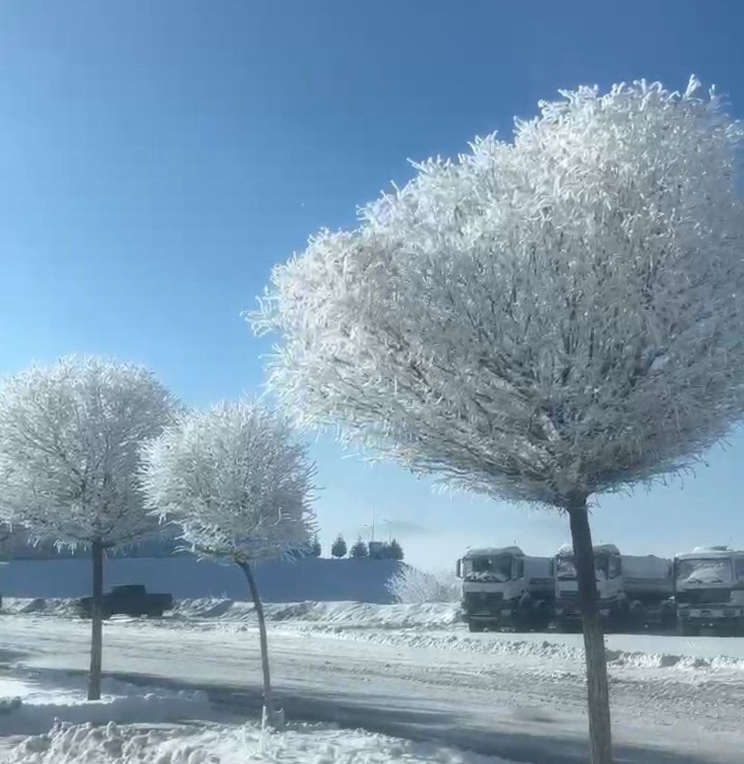 Adana’nın Tufanbeyli ilçesinde hava sıcaklıklarının gece saatlerinde eksi 20 dereceye kadar düşmesiyle birlikte oluşan kırağı; ağaçların, çalıların ve elektrik tellerinin üzerini kaplayarak kartpostallık görüntüler ortaya çıkardı.