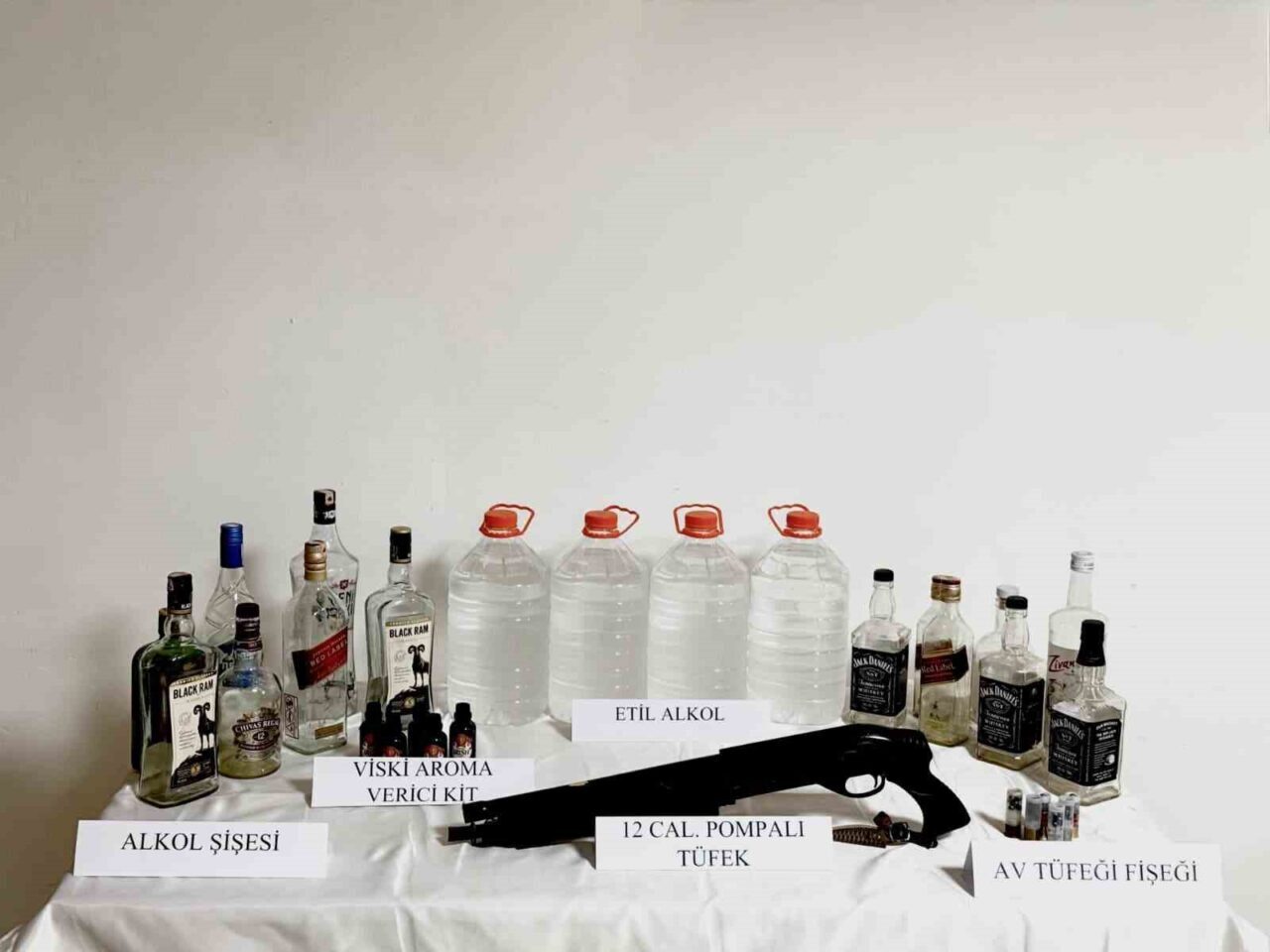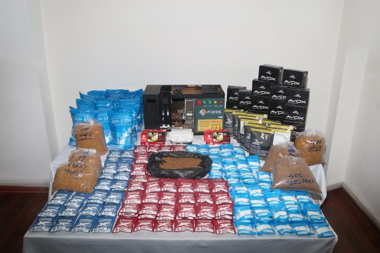 Operasyonlar sırasında gerçekleştirilen aramalarda; 1 adet elektrikli sigara sarma makinesi, 181 bin 940 adet sigara filtresi, 12 bin 877 gram kıyılmış sarmalık tütün, 907 adet makaron, 20 litre etil alkol, 5 adet alkol aroma kiti, 14 adet doluma hazır alkol şişesi ve 1 adet ruhsatsız av tüfeği ele geçirildi.