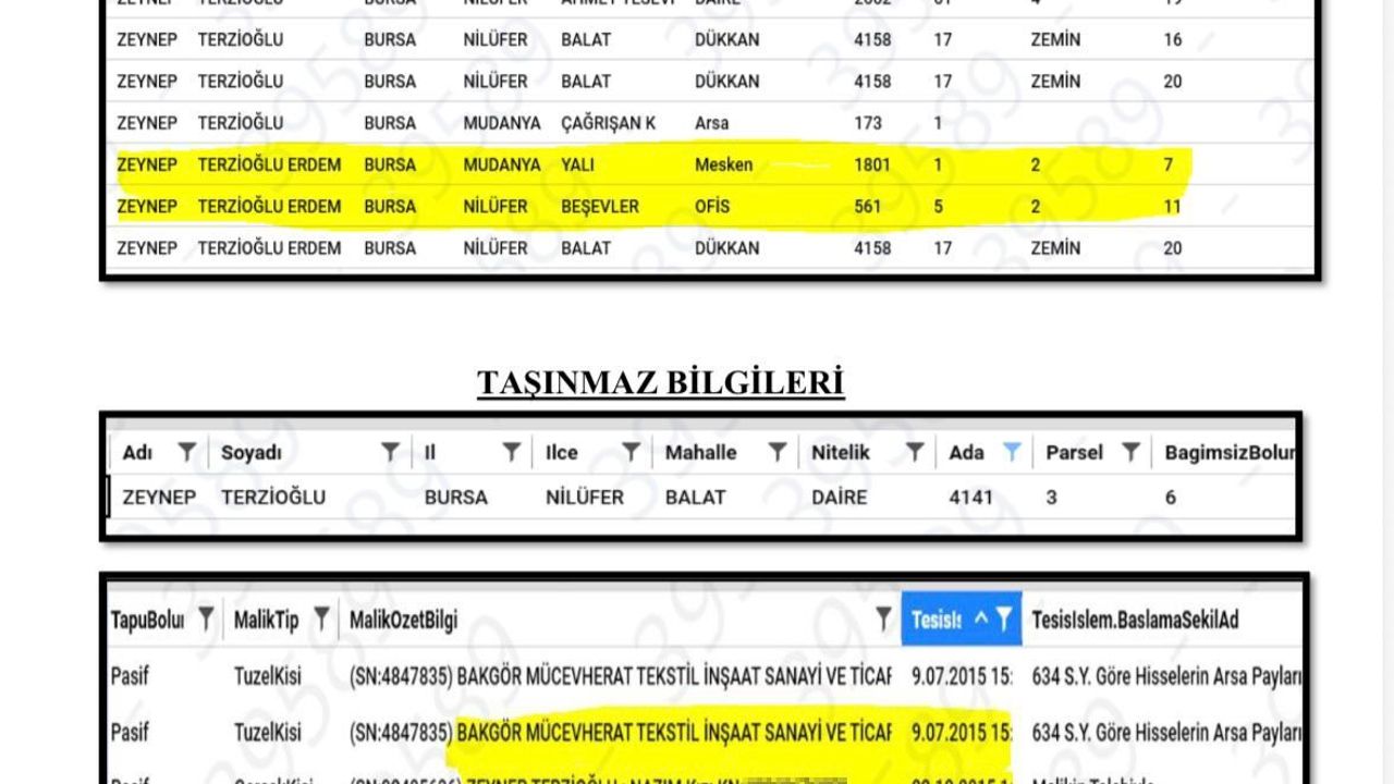 Adanur, firmanın bu artış karşılığında Erdem'e bir daire ve bir dükkân rüşvet olarak verdiğini ileri sürdü. Erdem'in rüşvet olarak aldığı bu taşınmazları o dönem sevgilisi olan Zeynep Terzioğlu'nun üzerine kaydettiğini belirtti. Bu durumu daha sonra tapudan öğrenen Adanur, Terzioğlu'na dönemin Nilüfer Belediyesi'ne ait bir kütüphanede memur olarak çalıştığını hatırlatarak, “Sen memursun. Ekonomik olarak her şeyin belli. Bir memur olarak Balat Mahallesi'nde bir dükkân ve bir daireyi üzerine alman manyaklık” dedi.