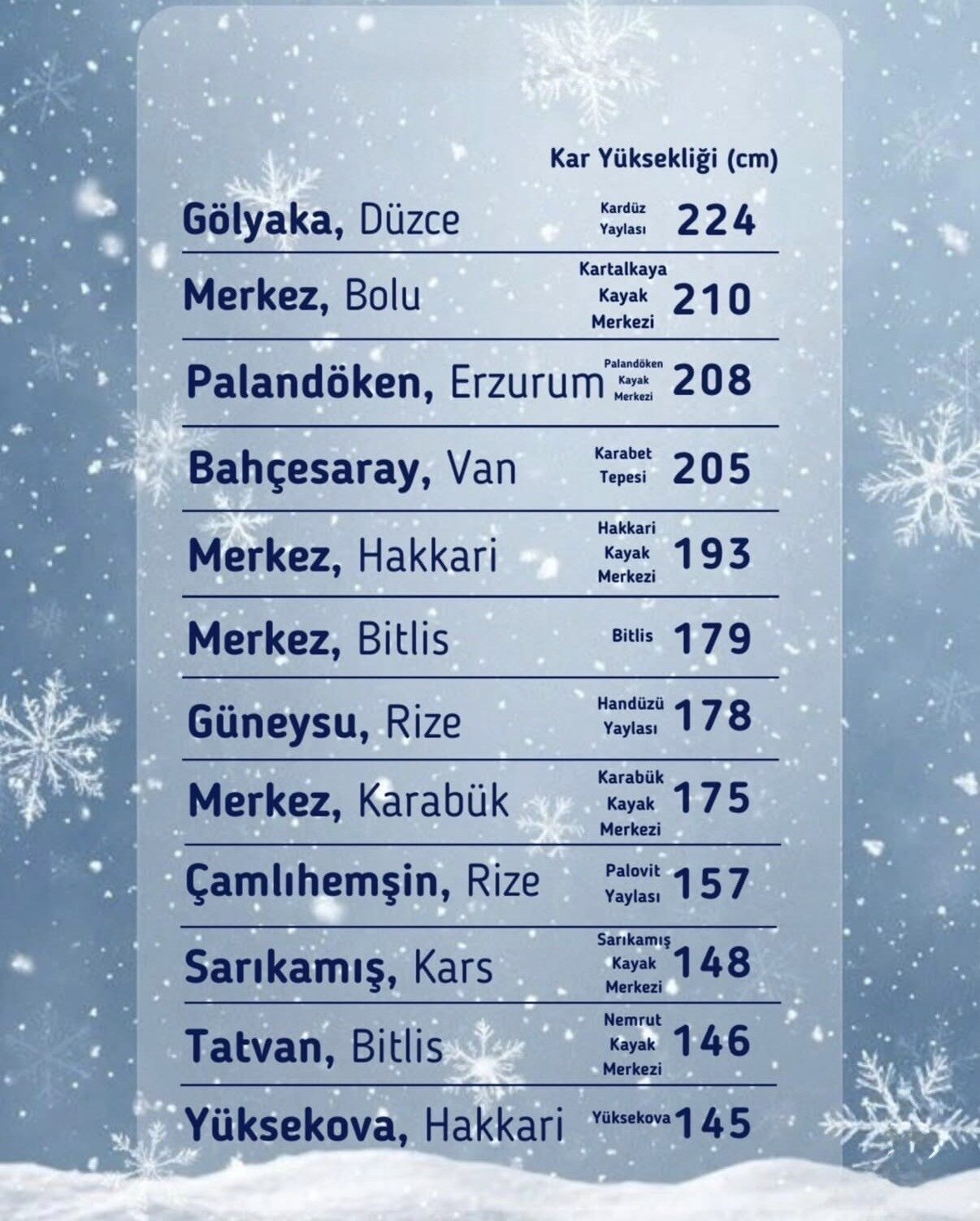 Düzce’nin 1830 rakımlı Kardüz Yaylası, Türkiye’nin en yüksek kar kalınlığına ulaşan noktası oldu. 224 santimetre yükseklik ile birinci sıraya çıkan Kardüz Yaylasını, 210 santim ile Bolu Kartalkaya, 208 santim ile Erzurum Palandöken, 205 santim ile Van Bahçesaray Karabat Tepesi, 193 santim ile Hakkari, 179 santim ile Bitlis, 178 santim ile Rize Güneysu Handüzü Yaylası, 175 santim ile Karabük, 157 santim ile Rize Çamlıhemşin Palovit Yaylası, 148 santim ile Kars Sarıkamış, 146 santim ile Bitlis Tatvan ve 145 santim ile Hakkari Yüksekova takip ediyor.