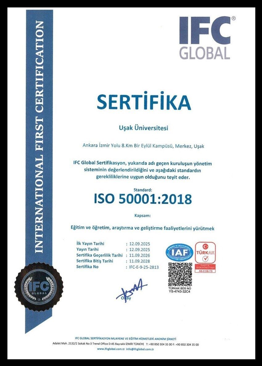 Uşak Üniversitesi, 2025-2029 Stratejik Planı çerçevesinde yürüttüğü projelerle enerji verimliliği alanında uluslararası ölçekte kayda değer bir başarıya imza atarak “TS EN ISO 50001 Enerji Yönetim Sistemi” sertifikasını almayı başardı.
