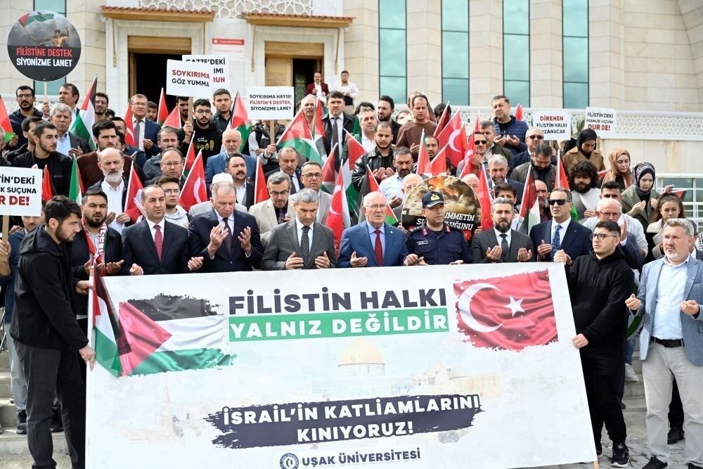 “Uşak’tan Gazze’ye Direnişe Bin Selam” sloganıyla düzenlenen etkinlikte, katılımcılar “Nehirden Denize Özgür Filistin” ve “Katil İsrail Filistin’den Defol” yazılı pankartlarla birlikte Türk ve Filistin bayrakları taşıdılar. Rektör Prof. Dr. Ekrem Savaş da, Filistin’deki durumu soykırım olarak nitelendirerek, okunan duaların vicdanların haykırışı olduğunu belirtti.