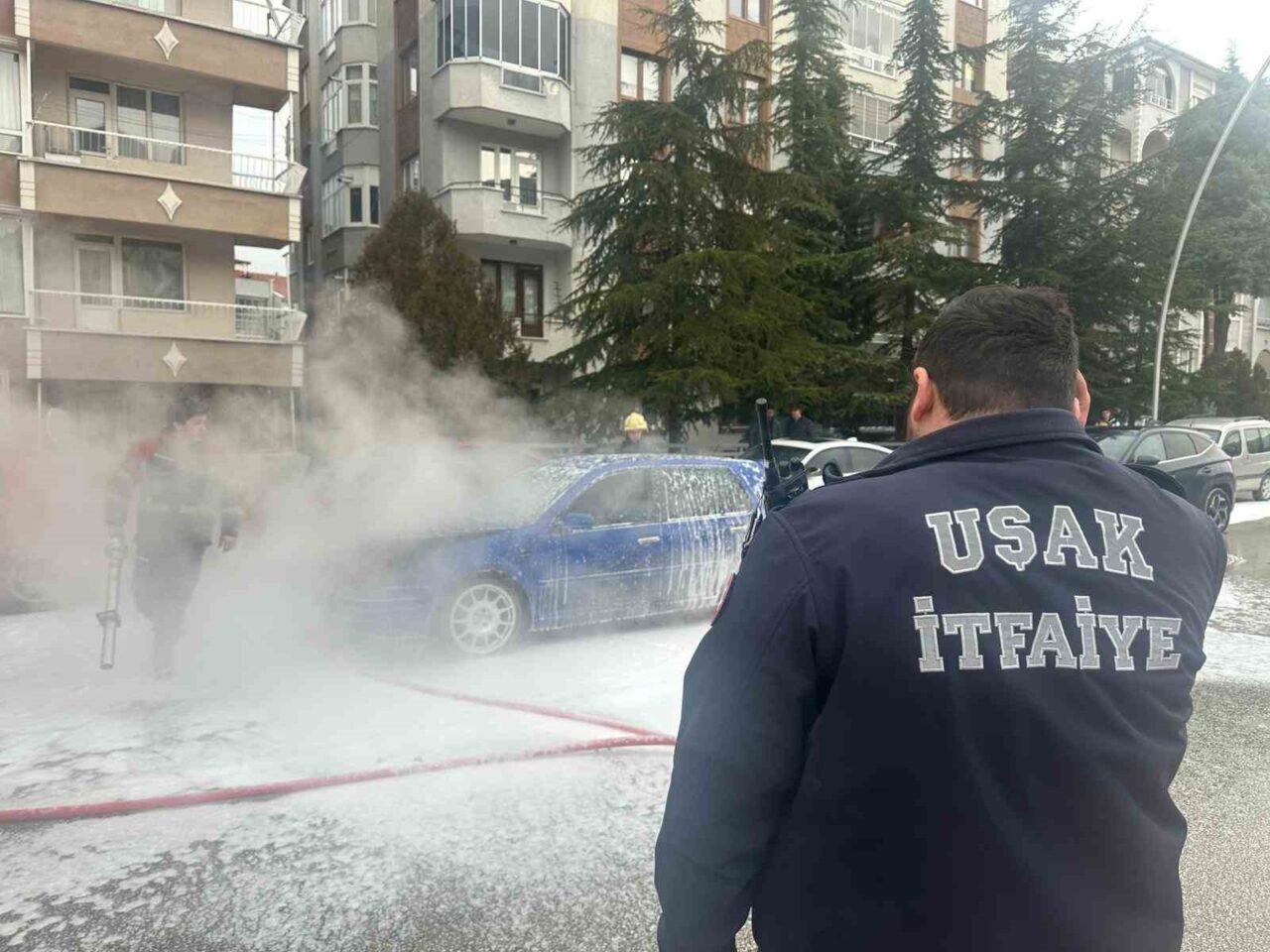 Uşak’ta seyir halindeyken motor kısmından alev alan otomobil, itfaiye ekiplerince söndürüldü.