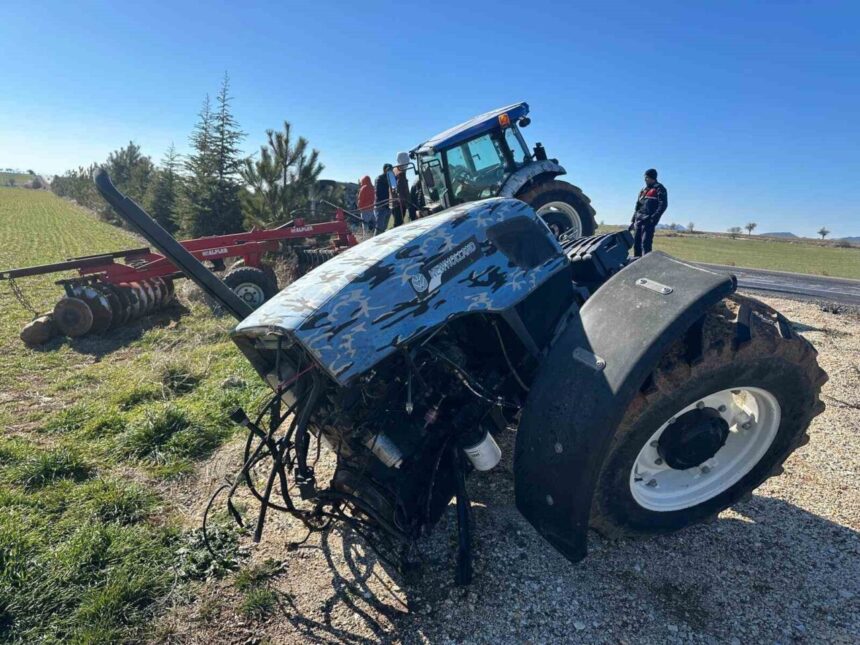 Uşak’ta traktör ile kamyonet çarpıştı, sürücü hastaneye kaldırıldı. Traktör parçalandı.