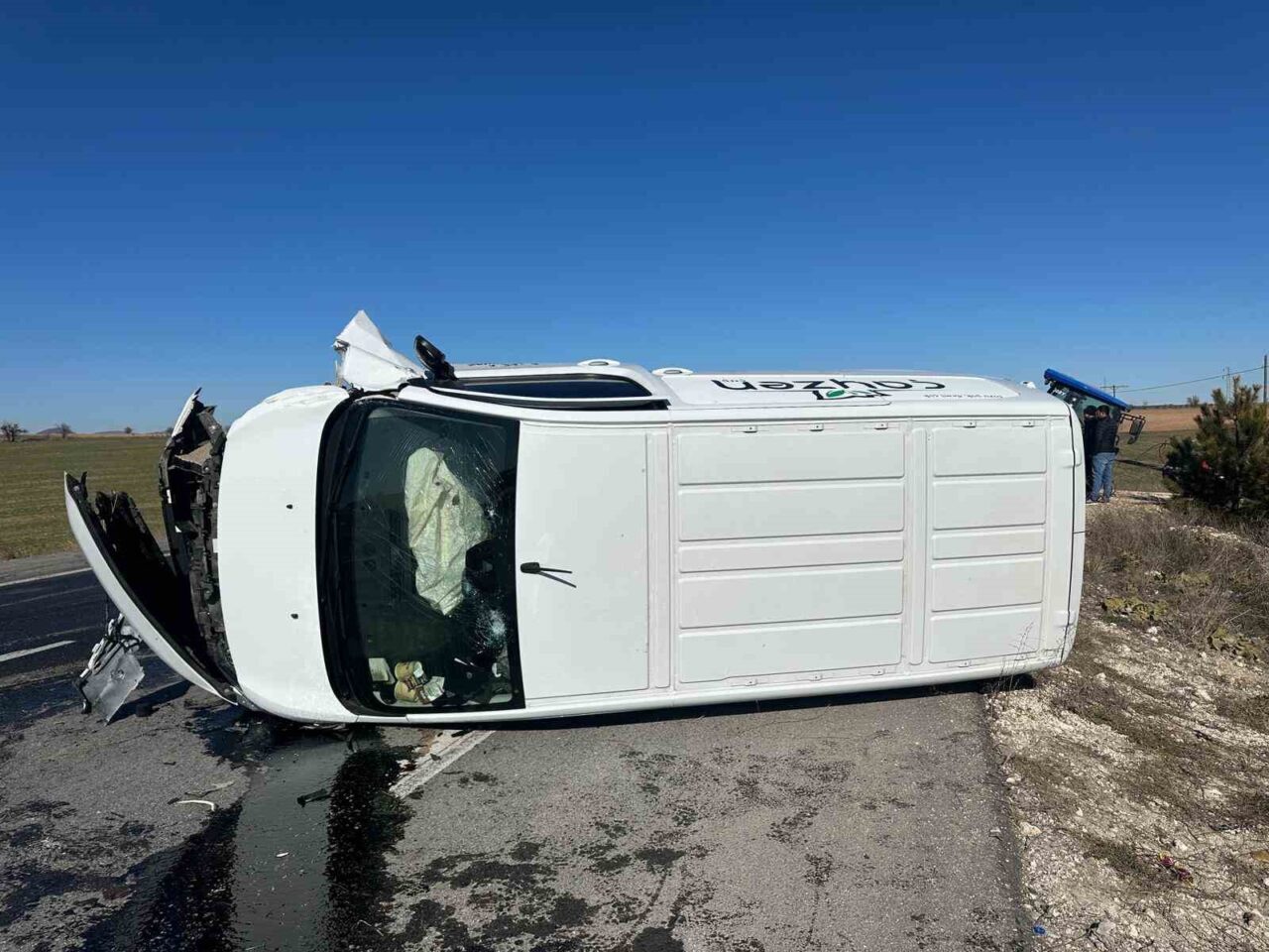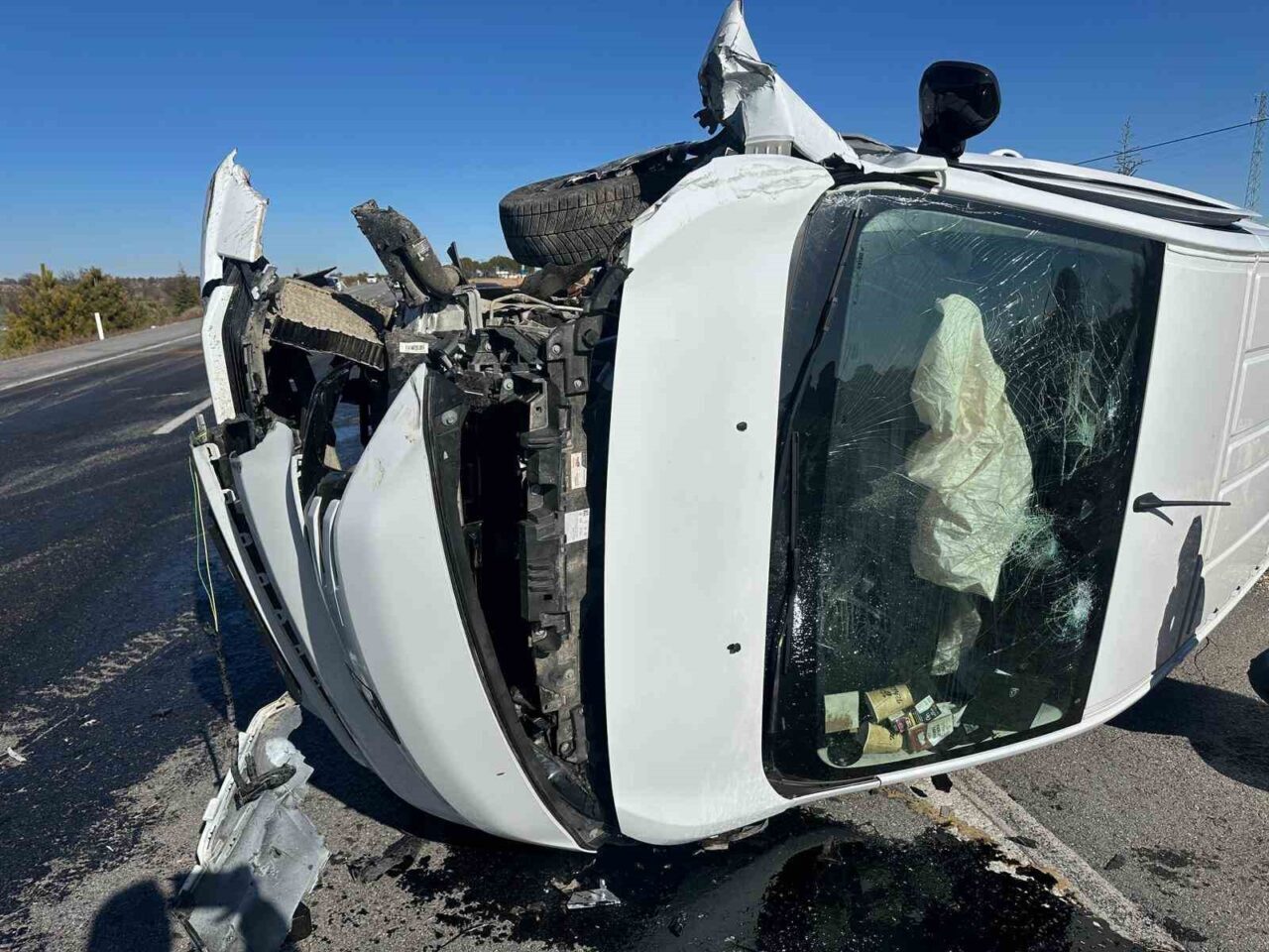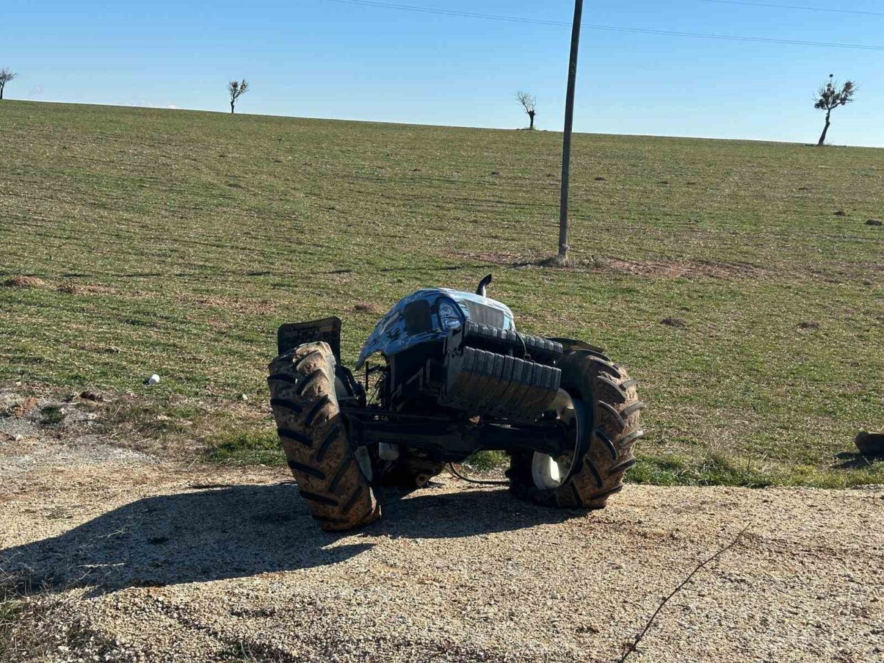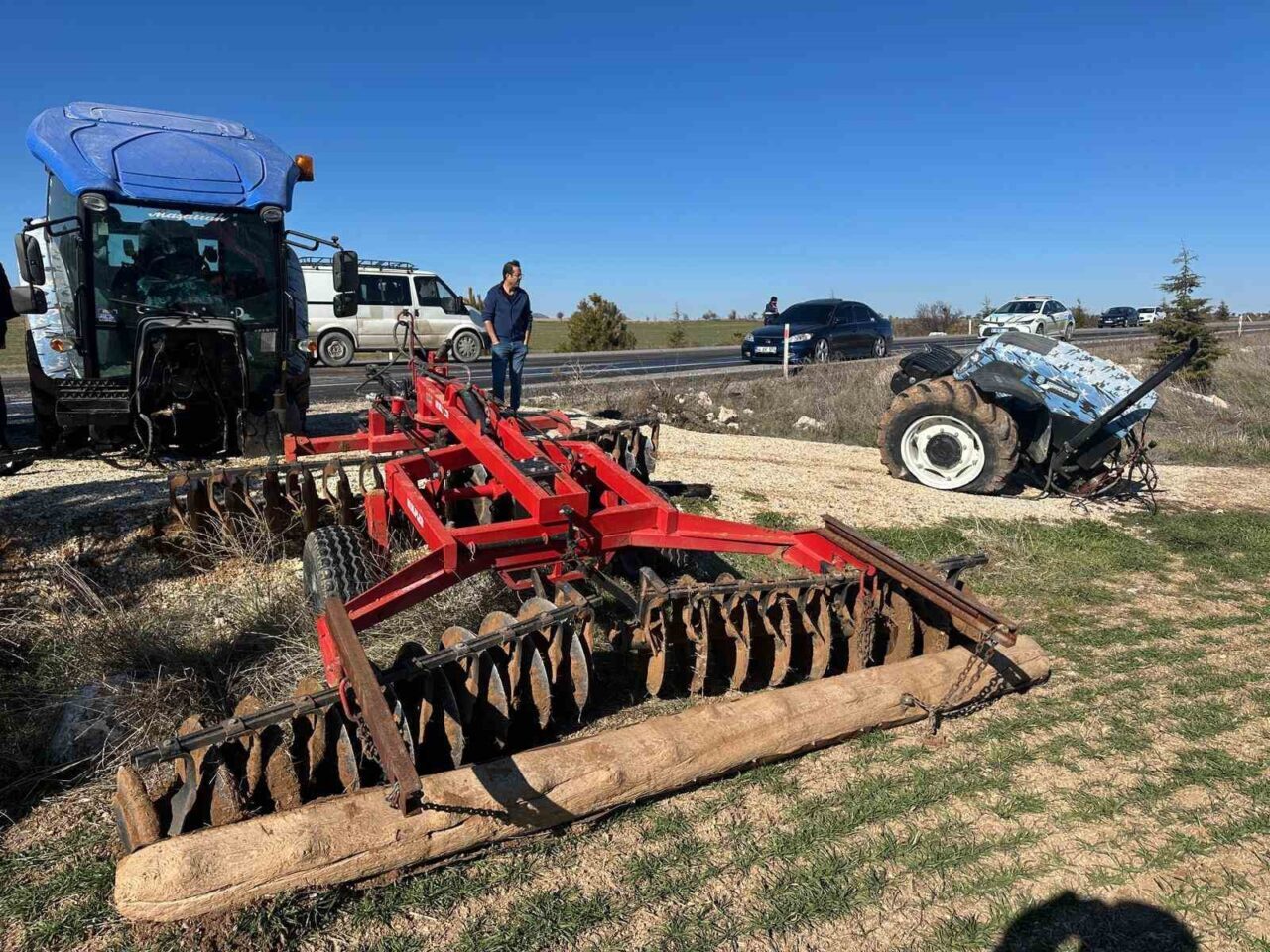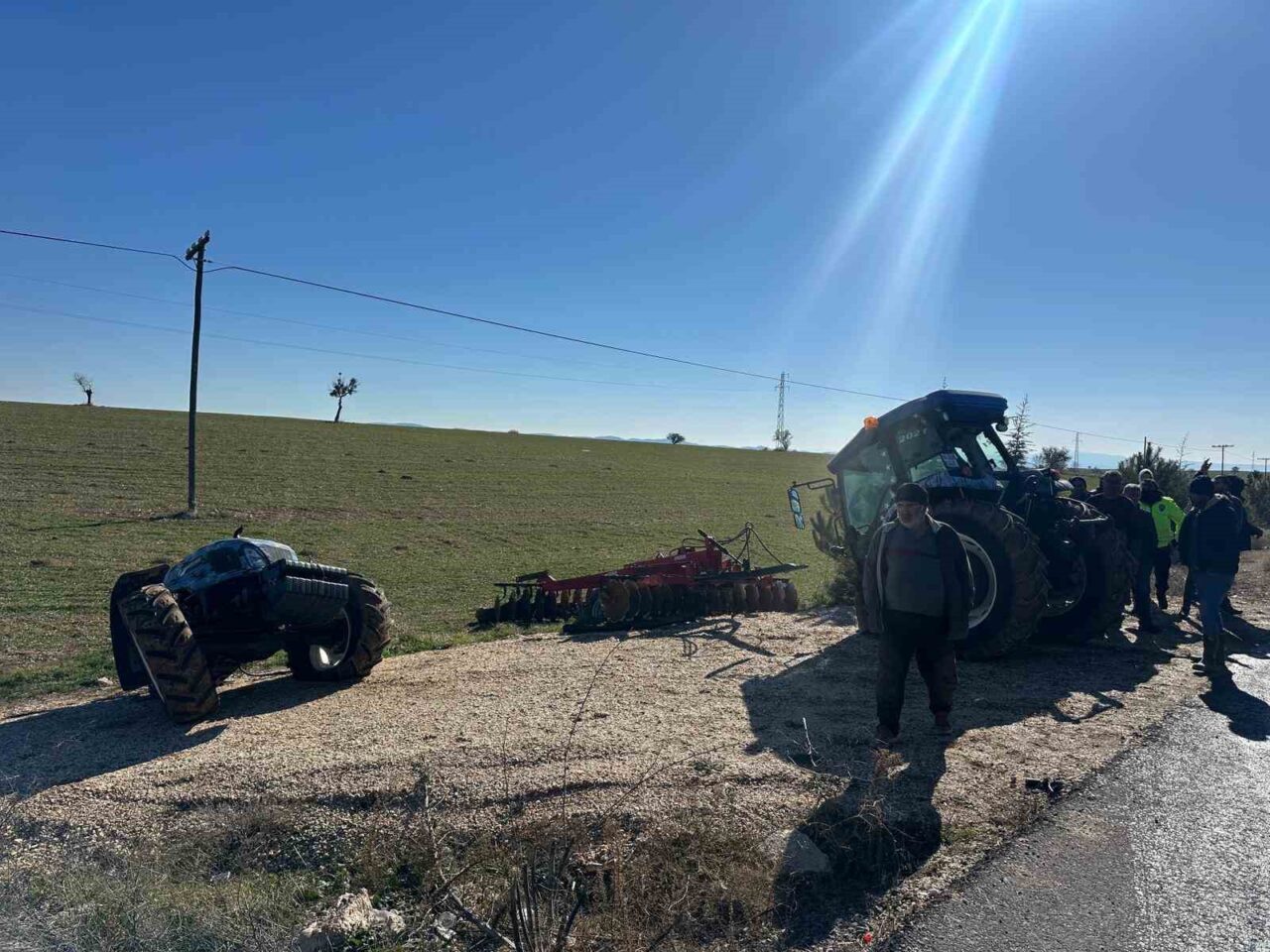 Uşak’ta traktör ile kamyonetin çarpışması sonucu meydana gelen kazada traktör ikiye bölünürken, traktör sürücüsü yaralanarak hastaneye kaldırıldı.